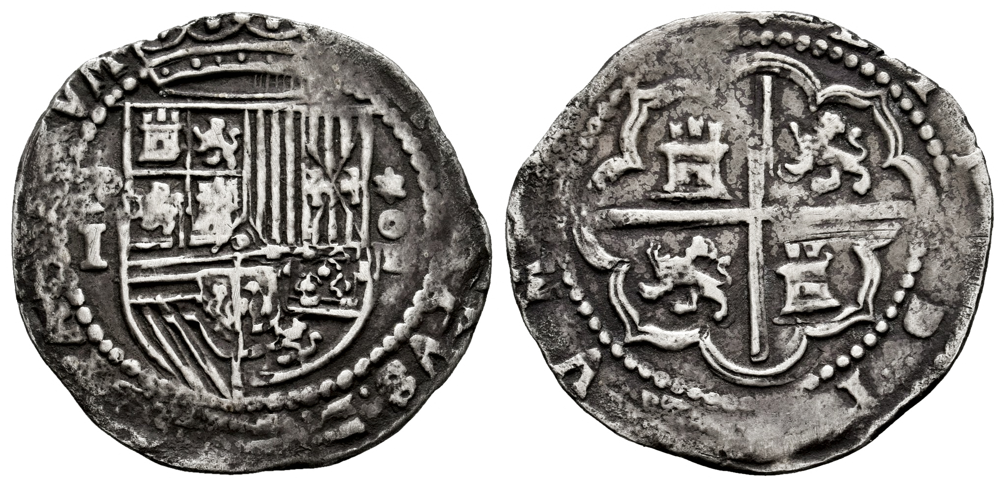 Felipe II (1556-1598). 1 real. ND (1577-1588). Lima. D (Diego de la Torre). (Cal-215). Ag. 3,37 g. P/I a la izquierda del escudo, ✶/oD a la derecha. Visible parte del nombre del rey. Tono. Rara. MBC+. Est...300,00.