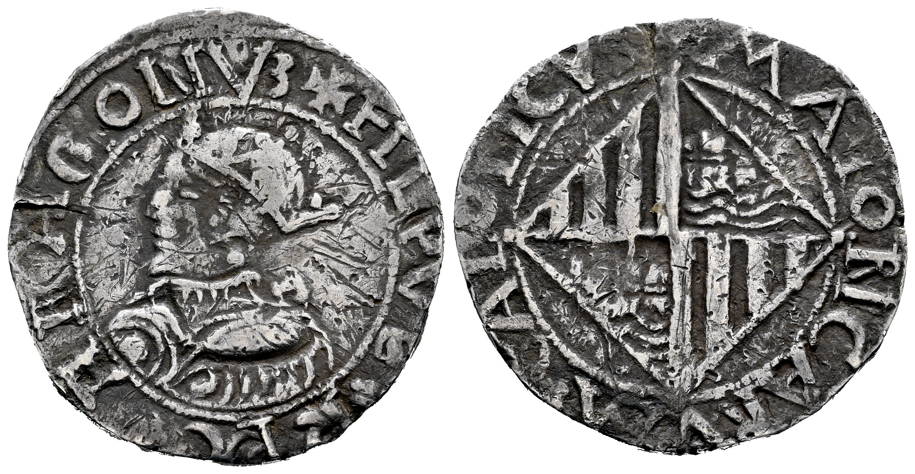 Felipe II (1556-1598). 2 reales. ND. Mallorca. (Cal-346). (Cru C.G-4252b). Anv.: + FILPVS ✤ REX ✤ ARAGONV3. Rev.: + MAIORICARVM ✤ CATILICVS. Ag. 4,83 g. Sin valor ni ensayador. Grieta y rayas. Muy rara. MBC. Est...700,00.