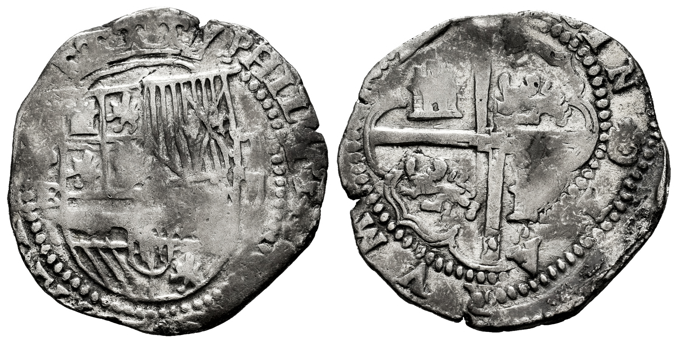 Felipe II (1556-1598). 2 reales. ND (1578-1595). Potosí. B. (Cal-370). Ag. 6,70 g. Doble acuñación en anverso. MBC-. Est...90,00.