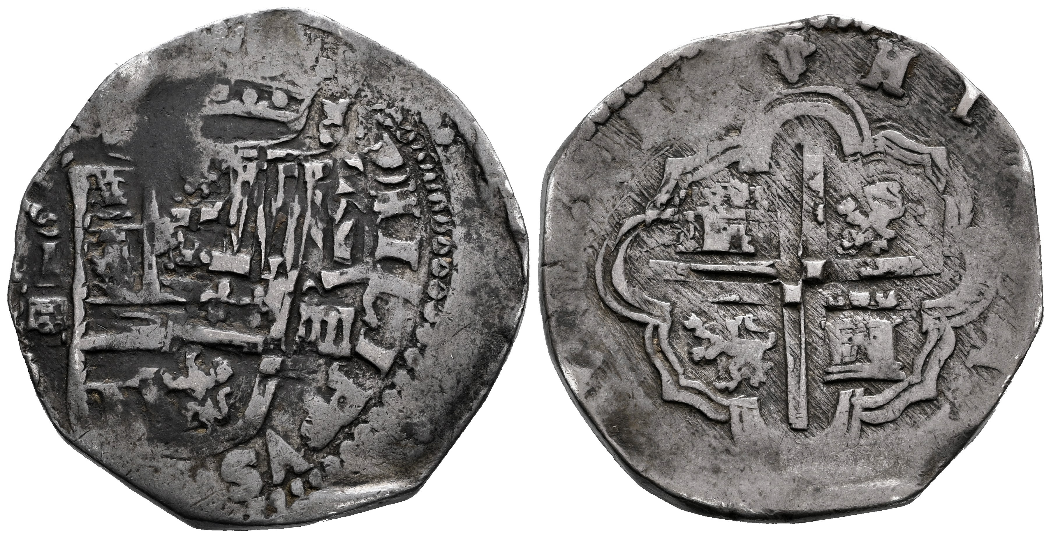 Felipe II (1556-1598). 4 reales. 1591. Segovia. I. (Cal-539). Ag. 13,43 g. Fecha de 4 dígitos a la derecha del escudo. Visible el nombre del rey. Doble acuñación. Tono. Rara. MBC-/MBC. Est...300,00.