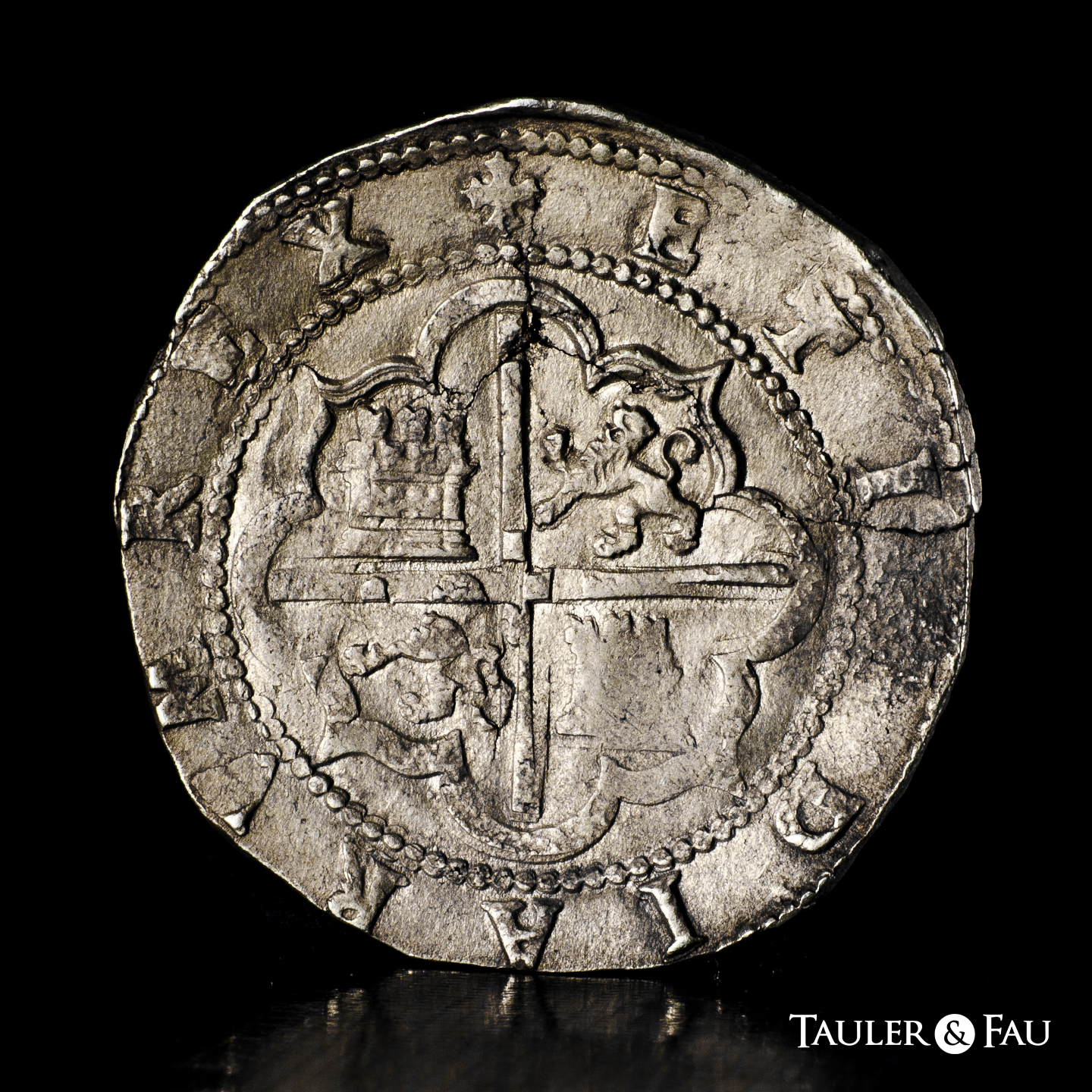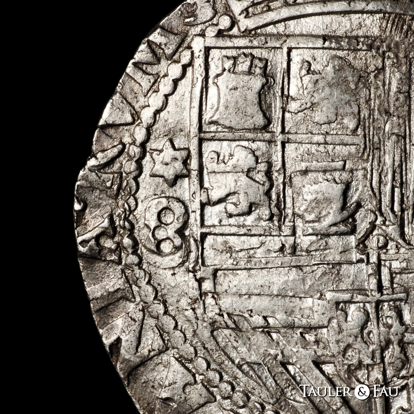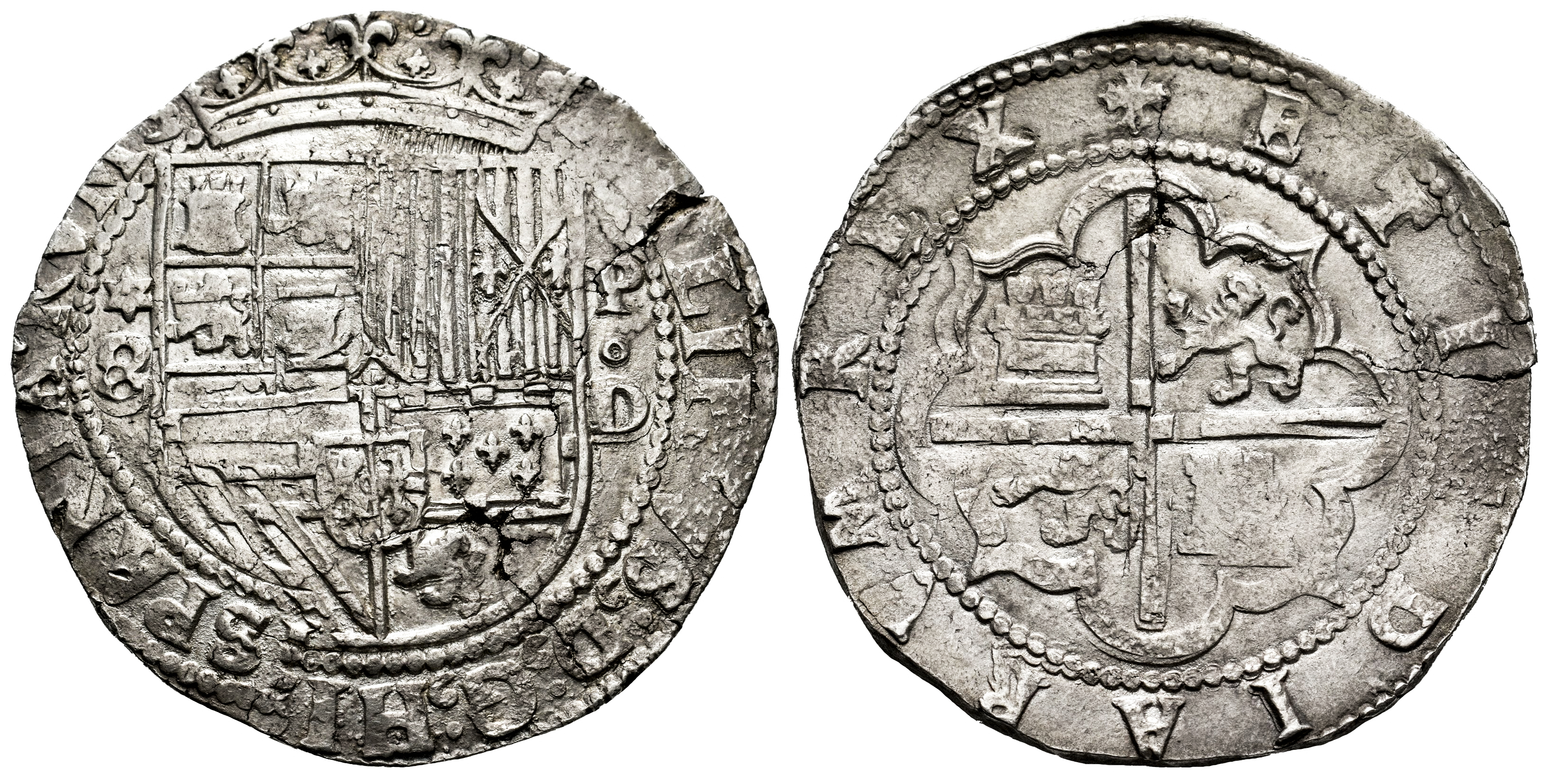 Felipe II (1556-1598). 8 reales. ND (1577-1588). Lima. D (Diego de la Torre). (Cal-654). Ag. 27,10 g. Escudo entre */8 y P/Do. Leyendas casi completas. Leves grietas y ligera doble acuñación. Rara. EBC-. Est...1500,00.