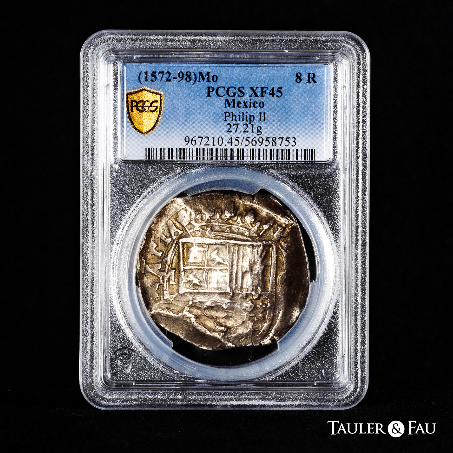 Felipe II (1556-1598). 8 reales. ND (1572-1589). México. (O). (Cal-662). Ag. 27,21 g. Pátina. Rara en esta conservación. Encapsulada por PCGS como XF 45 (Top Pop), el mejor ejemplar conservado en el censo de PCGS. Est...1200,00.