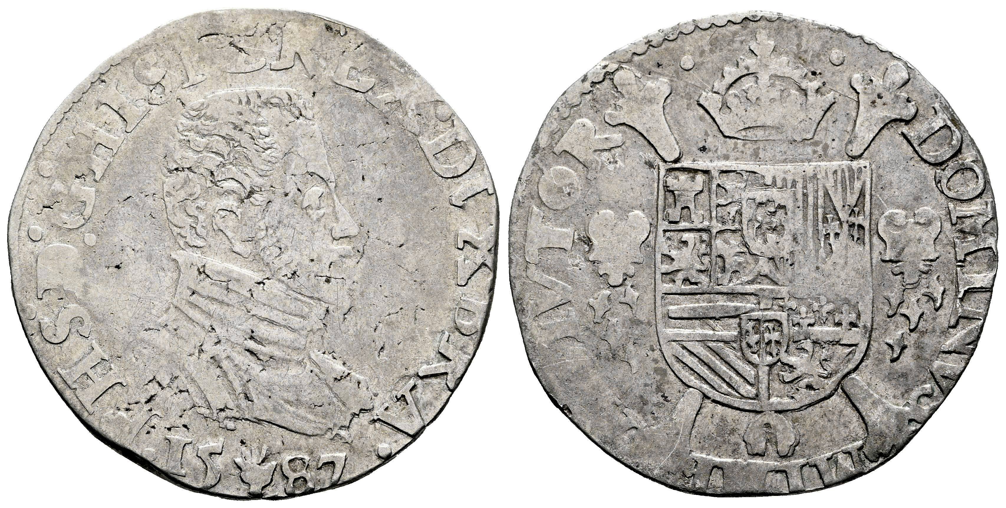 Felipe II (1556-1598). 1/5 de escudo felipe. 1587. Amberes. (Tauler-921). (Vti-898). (Vanhoudt-393.AN). Ag. 6,58 g. MBC. Est...80,00.
