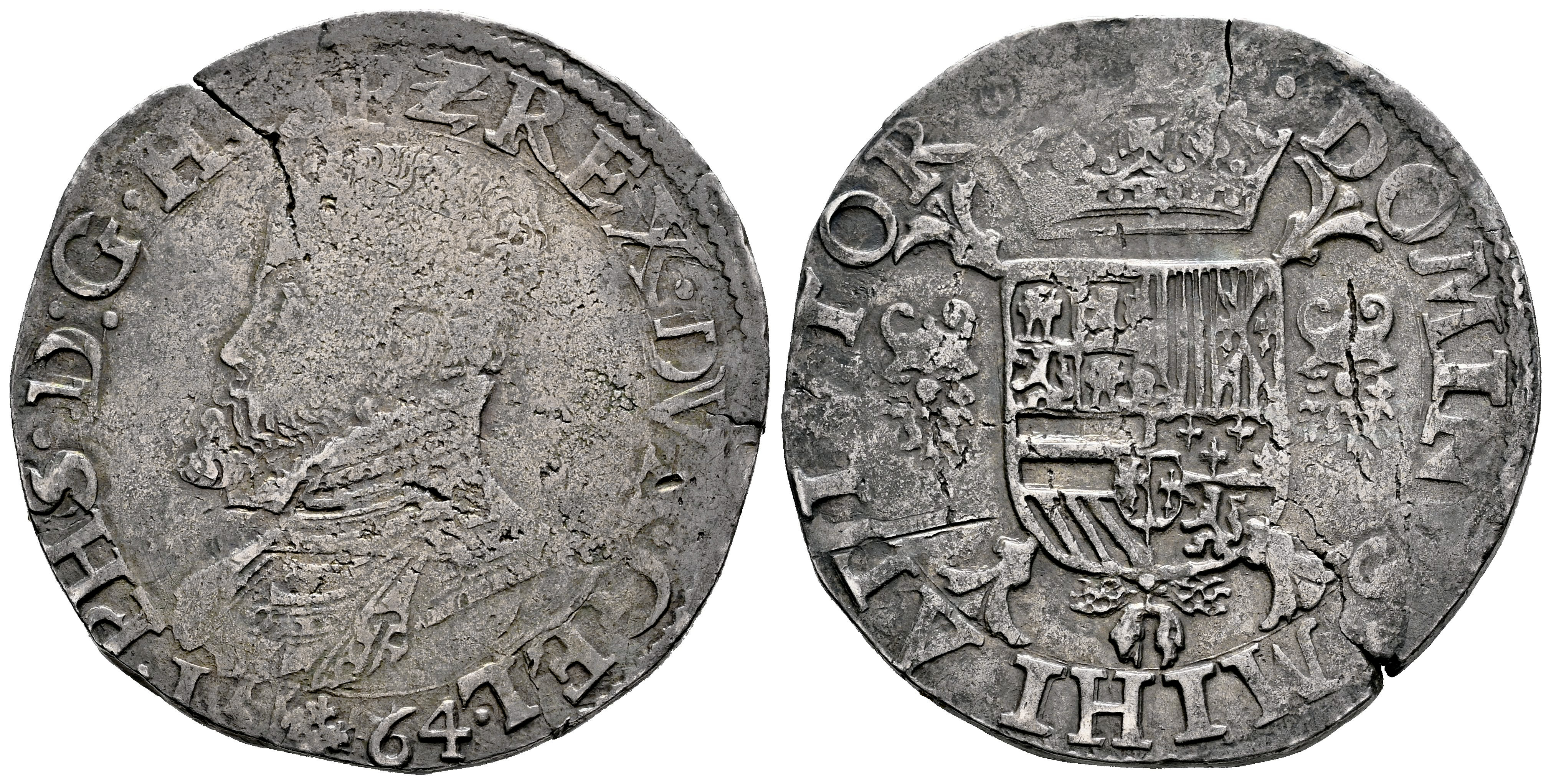 Felipe II (1556-1598). 1/2 escudo felipe. 1564. Nimega. (Tauler-1035). (Vti-995). (Vanhoudt-267.NJ). Ag. 16,67 g. Pátina. Grieta de acuñación. MBC. Est...150,00.