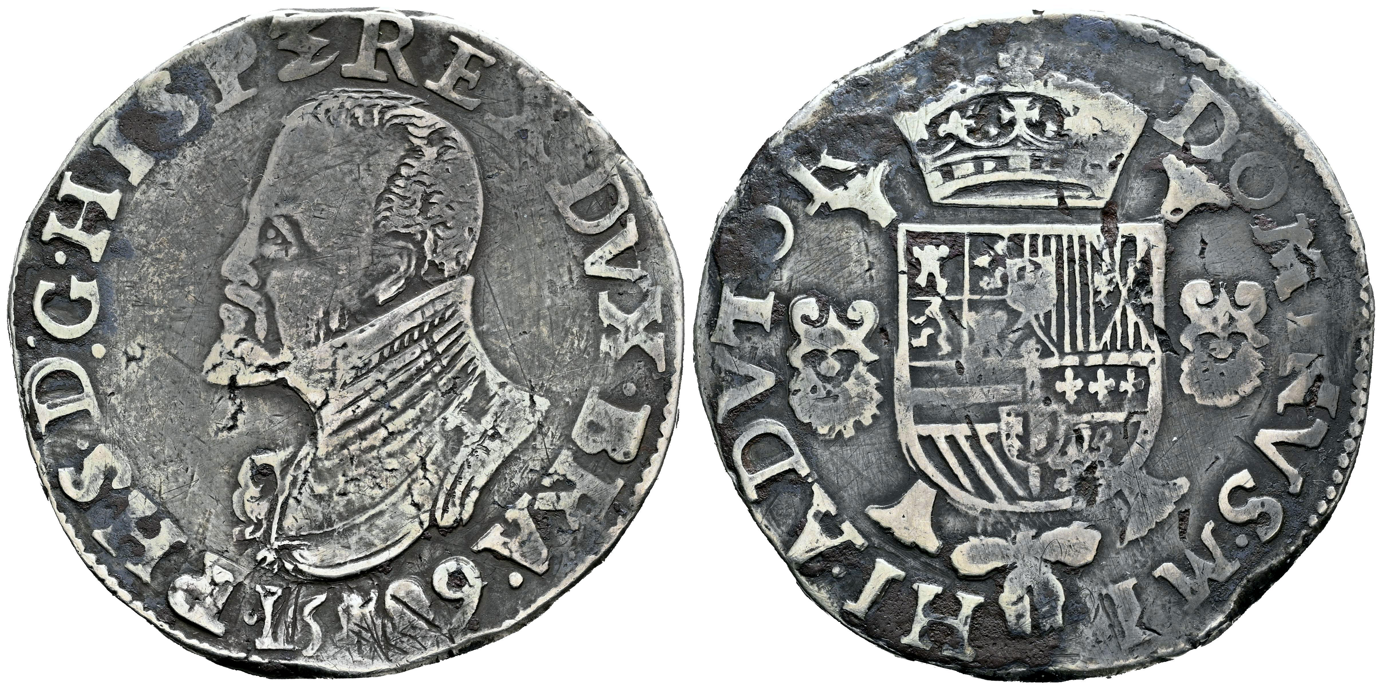 Felipe II (1556-1598). 1 escudo felipe. 1589. Amberes. (Tauler-1142). Ag. 33,00 g. Leves oxidaciones . MBC. Est...300,00.