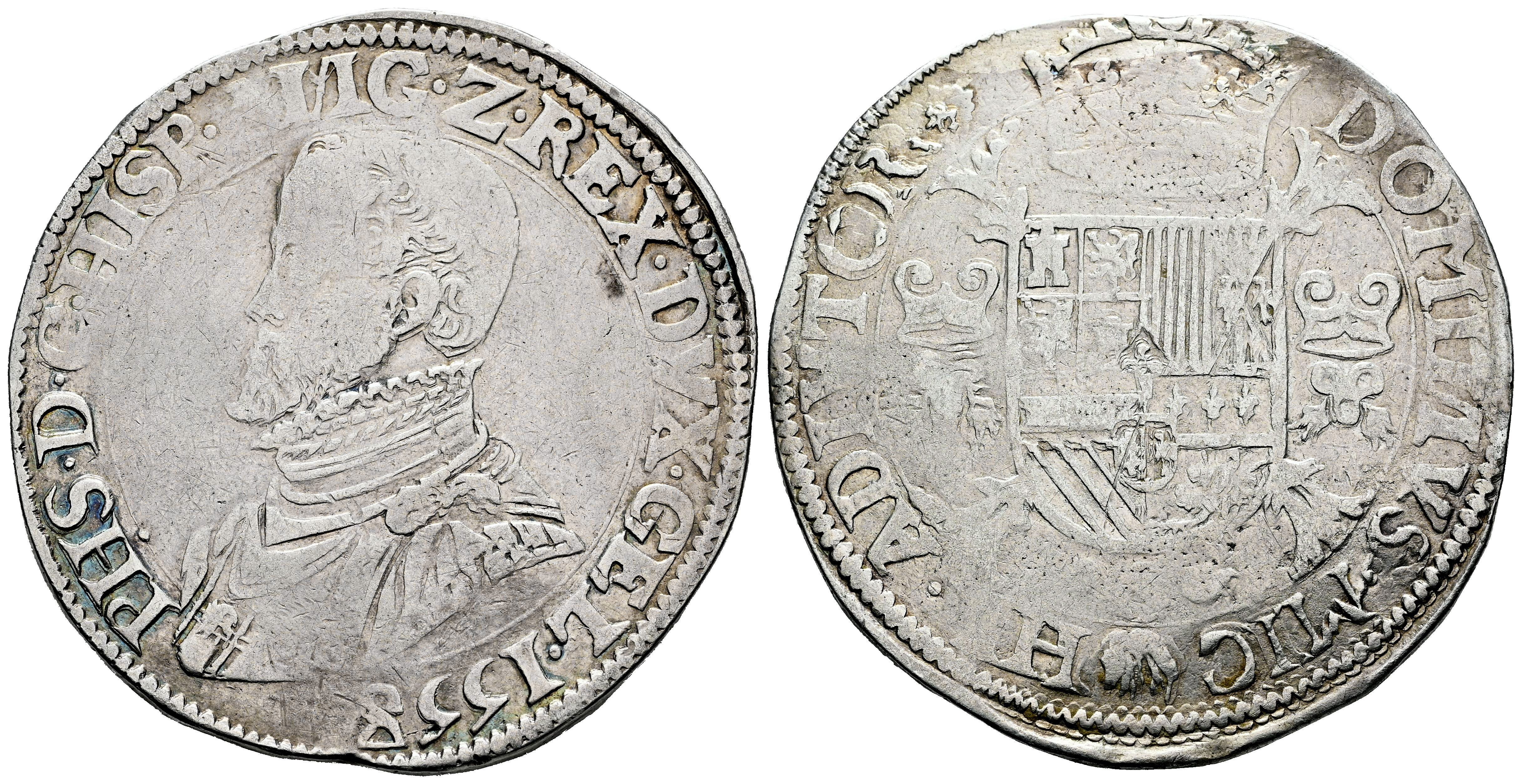 Felipe II (1556-1598). 1 escudo felipe. 1558. Nimega. (Tauler-1179). (Vti-1178). (Vanhoudt-253NIJ). Ag. 33,52 g. Limpiada. MBC/MBC-. Est...160,00.