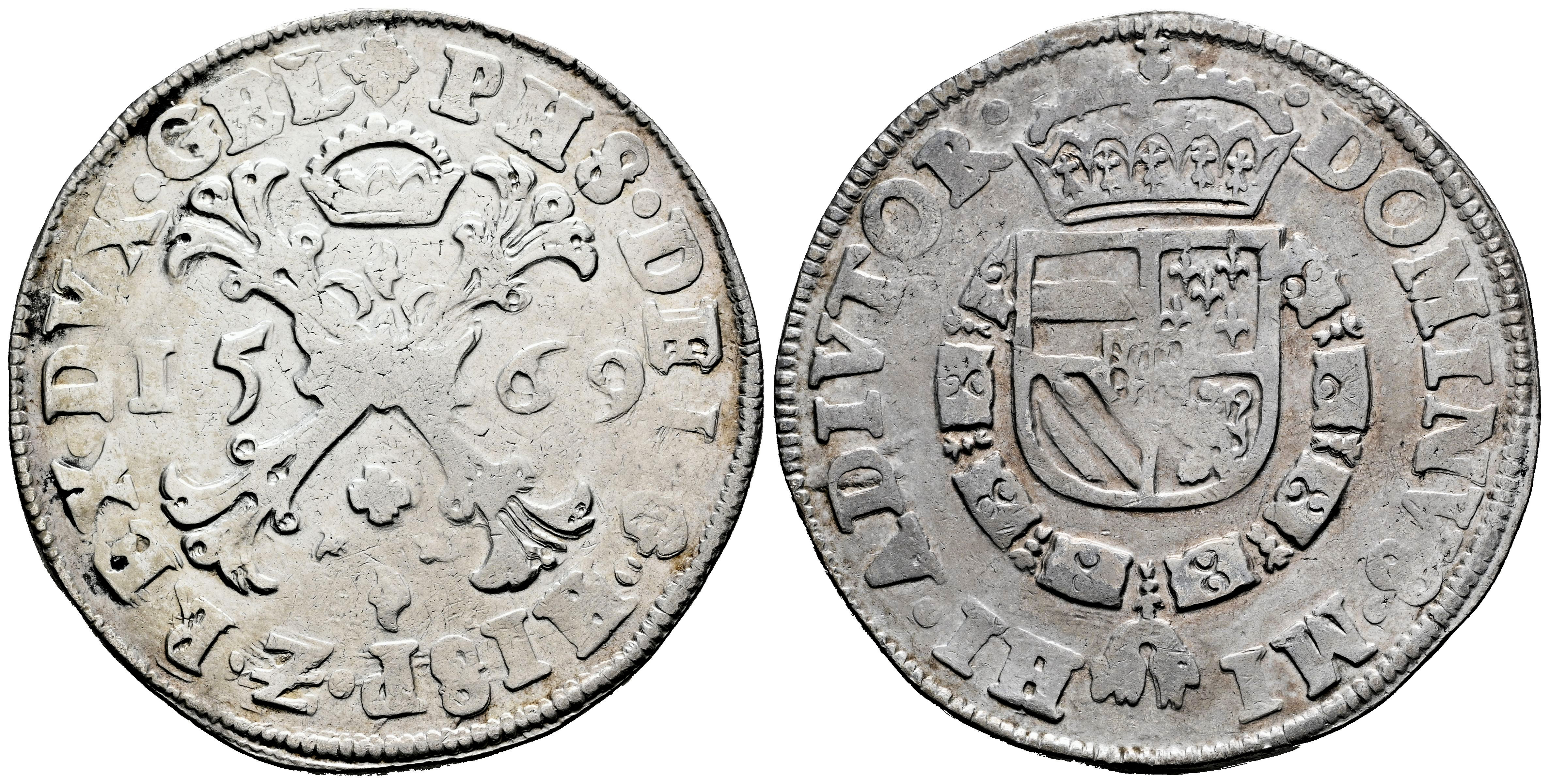 Felipe II (1556-1598). 1 escudo de Borgoña. 1569. Nimega. (Tauler-1282). (Vti-1312). (Vanhoudt-290.NJ). Ag. 28,95 g. Ligero tono y leves restos de brillo original. Acuñación algo floja pero muy buen ejemplar. MBC+. Est...350,00.
