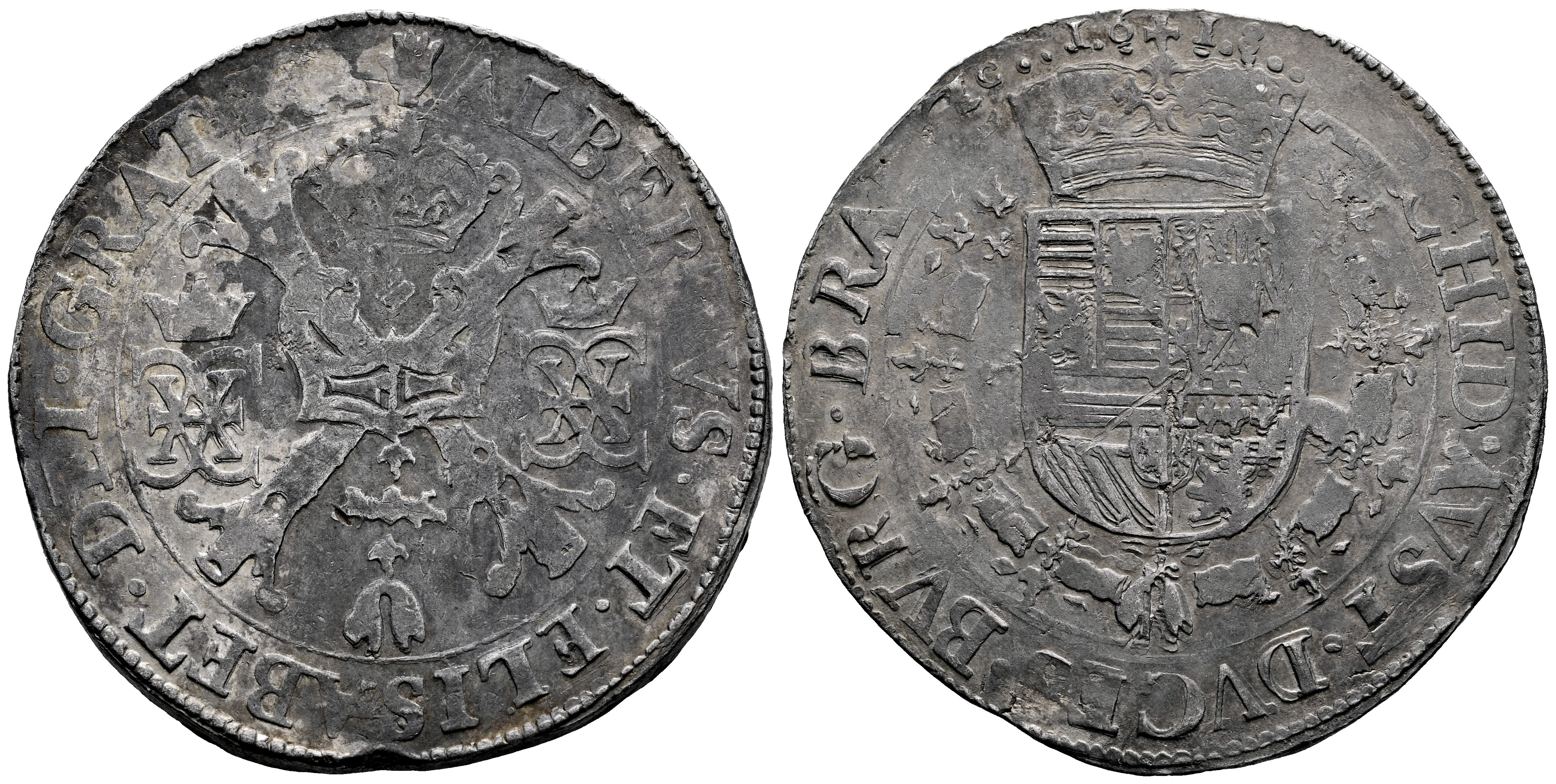 Alberto e Isabel (1598-1621). 1 patagón. 1618. Amberes. (Tauler-1701). Ag. 27,64 g. Pátina. Escasa. MBC. Est...200,00.