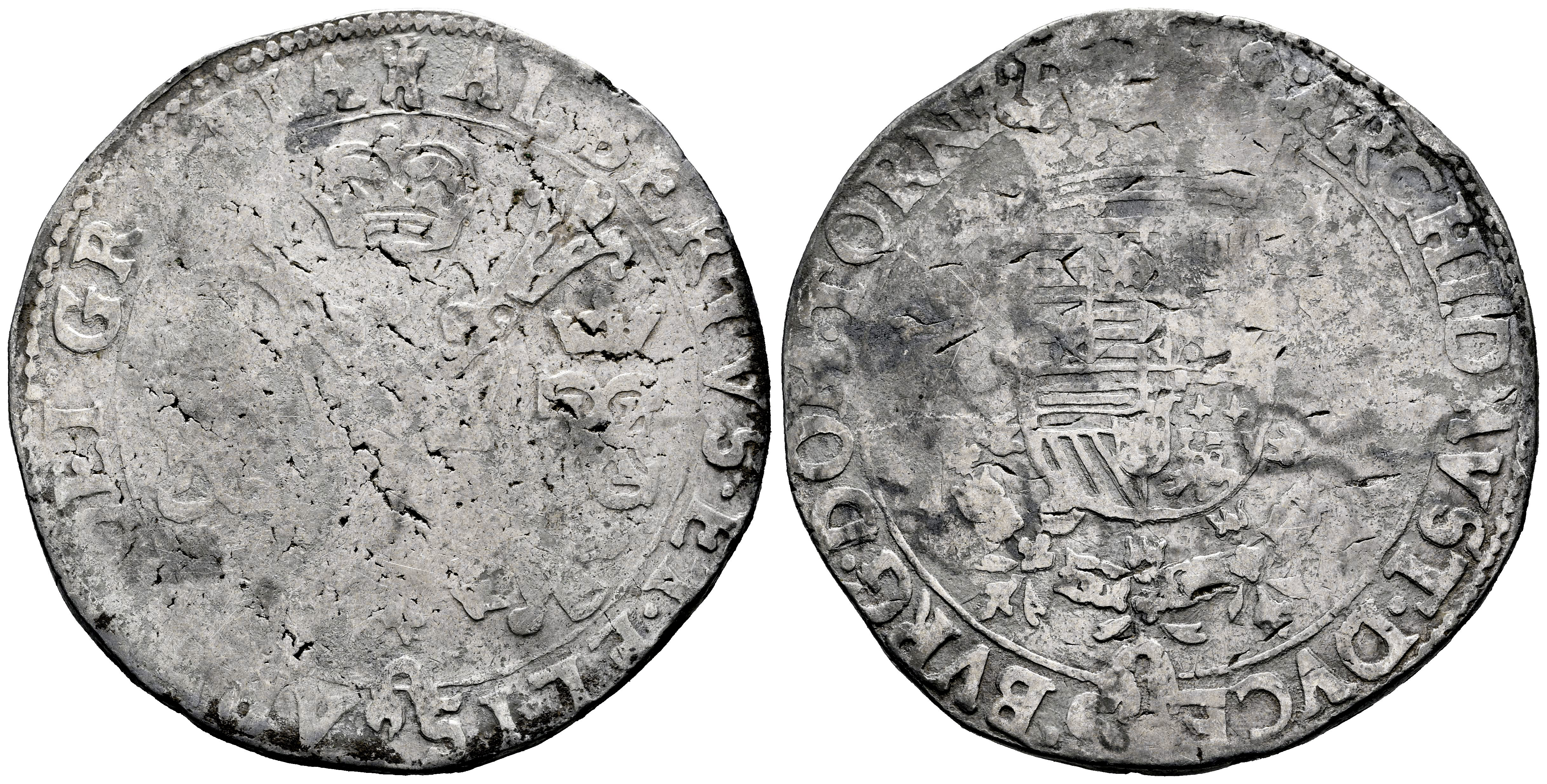 Alberto e Isabel (1598-1621). 1 patagón. 1620. Tournai. (Tauler-1729). (Vti-383). (Vanhoudt-619.TO). Ag. 27,60 g. Escasa. MBC-. Est...180,00.