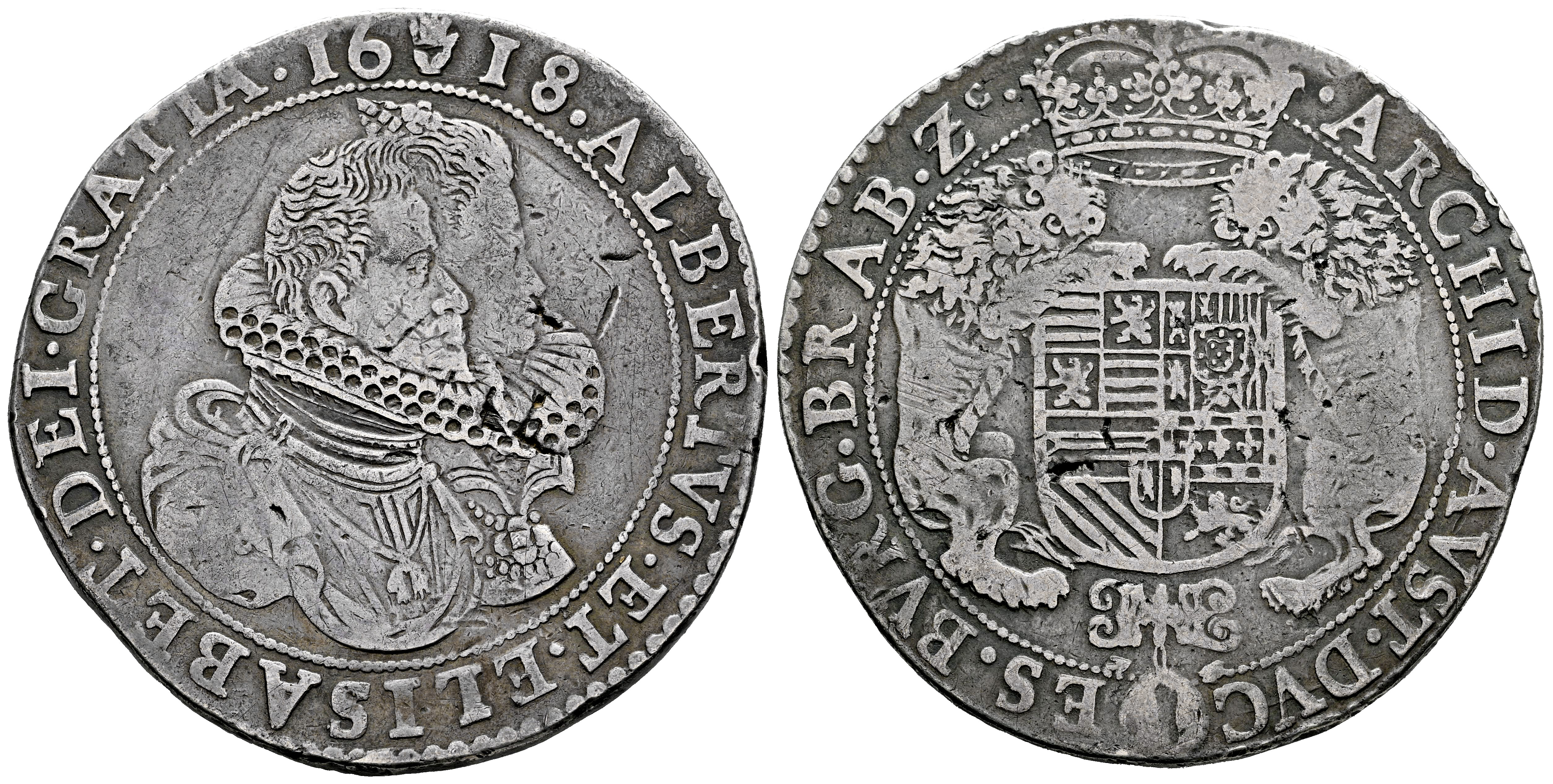 Alberto e Isabel (1598-1621). 1 ducatón. 1618. Amberes. (Tauler-1739). (Vti-387). (Vanhoudt-617.AN). Ag. 31,42 g. Pátina. MBC. Est...400,00.