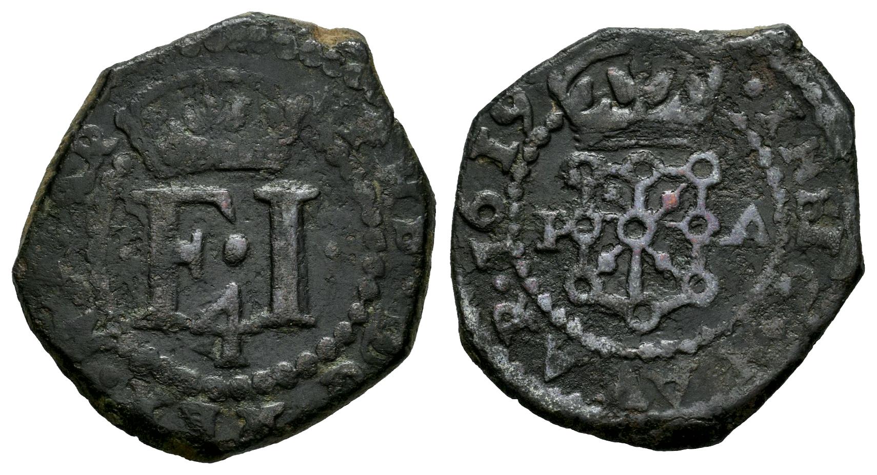 Felipe III (1598-1621). 4 cornados. 1619. Pamplona. (Cal-78). (Ros-4.4.30 var.). Anv.: FI acotado por puntos. P H S · DG · REX · NAVAR. Rev.: Escudo de Navarra coronado, acotado por P-A. · I N S I G · NAVAR · I 6 I 9 . Ae. 4,34 g. El 4 del valor parece estar rectificado sobre otro 4 tumbado. Rara. MBC. Est...50,00.