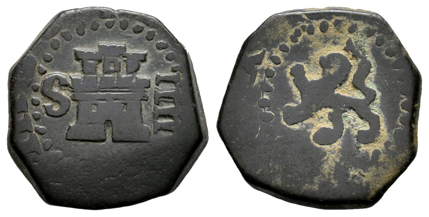 Felipe III (1598-1621). 4 maravedís. (1604). Sevilla. (Cal-273). (Jarabo-Sanahuja-D282). Ae. 3,44 g. Extremadamente rara. Muy pocos ejemplares conocidos. No hemos encontrado referencias de piezas similares vendidas en los últimos 20 años. MBC. Est...300,00.