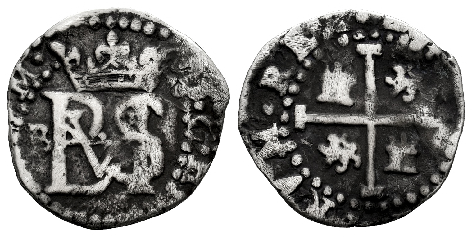 Felipe III (1598-1621). 1/2 real. ND (1698-1603). Potosí. B. (Cal-402). Ag. 1,53 g. B a la izquierda del monograma y sin marca de ceca. Rara. MBC. Est...250,00.