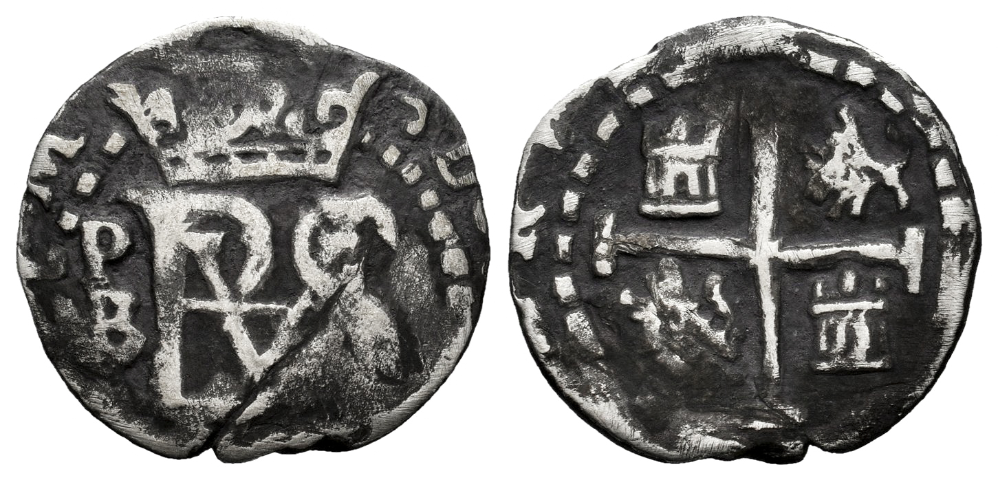 Felipe III (1598-1621). 1/2 real. ND (1596-1603). Potosí. B. (Cal-404). Ag. 1,52 g. P/B a la izquierda del monograma. Rara. MBC-. Est...120,00.