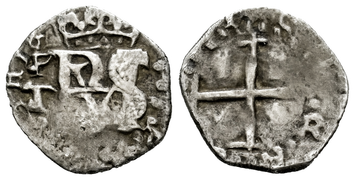 Felipe III (1598-1621). 1/2 real. ND (1618-1621). Potosí. T. (Cal-415). Ag. 1,37 g. Muy rara. MBC/MBC-. Est...300,00.