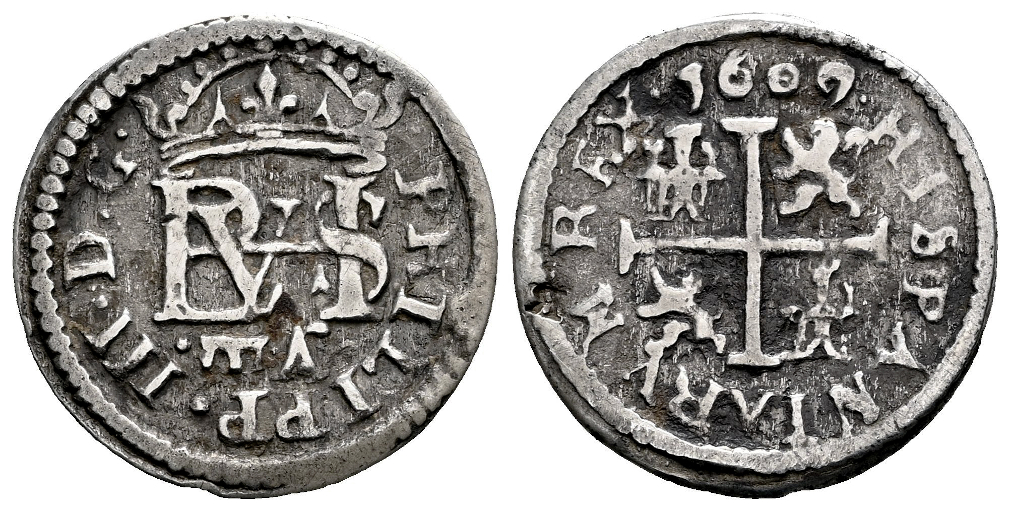 Felipe III (1598-1621). 1/2 real. 1609. Segovia. A/C. (Cal-No cita). (Jarabo-Sanahuja-B330). Ag. 1,25 g. Ensayador rectificado A sobre C. Punzón Я en el borde del reverso. Muy rara. MBC/MBC-. Est...200,00.