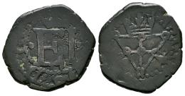 Felipe IV (1621-1665). 4 cornados. Pamplona. (Cal-75 var.). (Ros-4.5.24 var.). Anv.: F I acotadas por roeles. (PHILIP)VS : D : G : .... Rev.: Escudo de Navarra triangular coronado acotado por dos P-P superadas de roeles. INSINI .... Ae. 4,08 g. Muy escasa. Algunos especialistas en las acuñaciones de Navarra consideran que estas monedas con escudo triangular pertenecen a Felipe II. Existe un 4 cornados de escudo triangular con un resello de 4 maravedís de Granada de 1603, siendo imposible ver un resello de Felipe III en monedas de Felipe IV, lo que explicaría el error de clasificación siendo lo correcto atribuirlas al reinado de Felipe II. MBC-. Est...150,00.