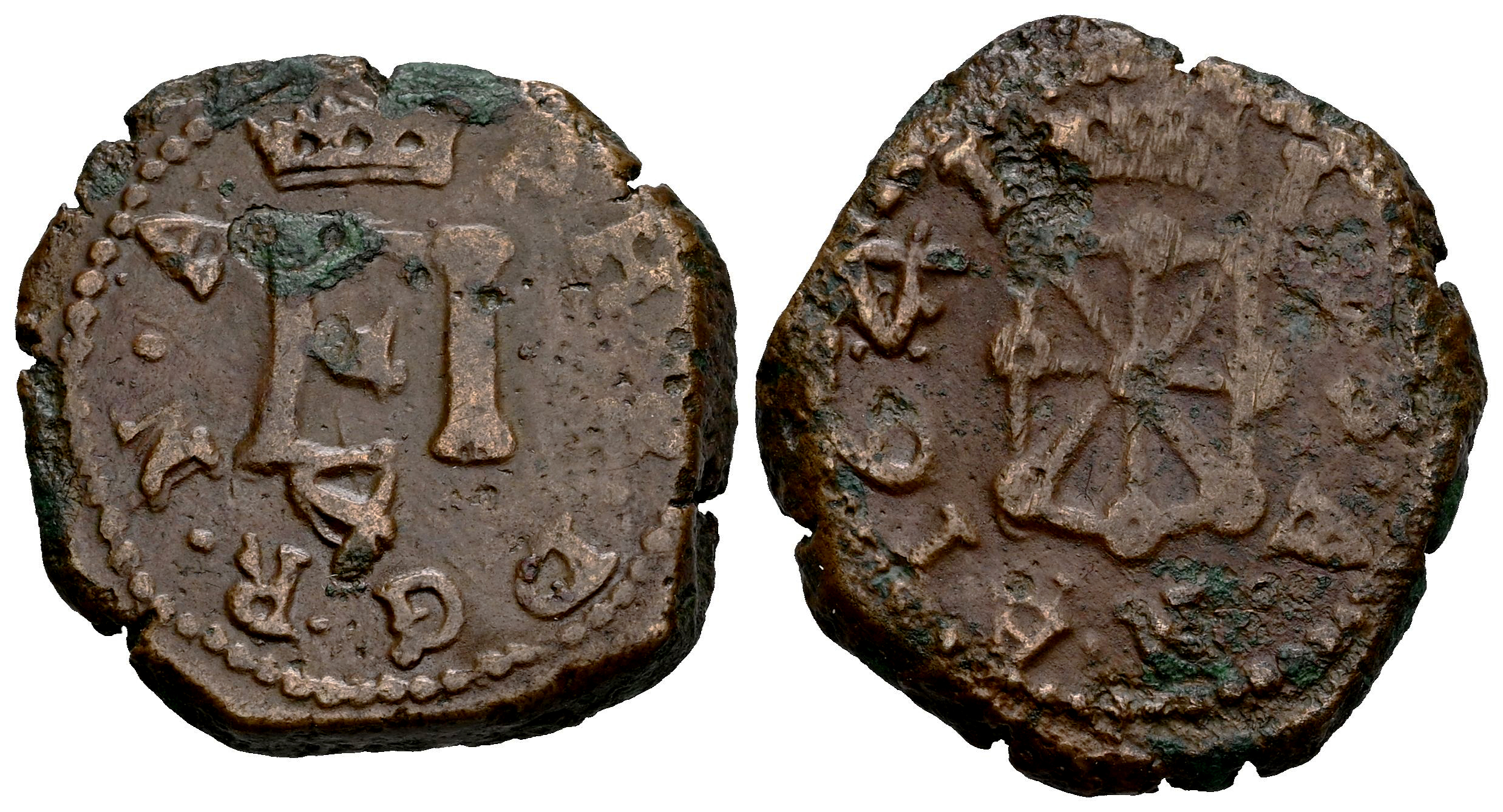 Felipe IV (1621-1665). 4 cornados. 1641. Pamplona. (Cal-82 var.). (Ros-4.5.21 var.). Anv.: P H S · D G · R · N · A. Rev.: I · N · S · A · N · A · 1 6 :4 1. Ae. 6,45 g. Escasa. MBC+/MBC. Est...70,00.