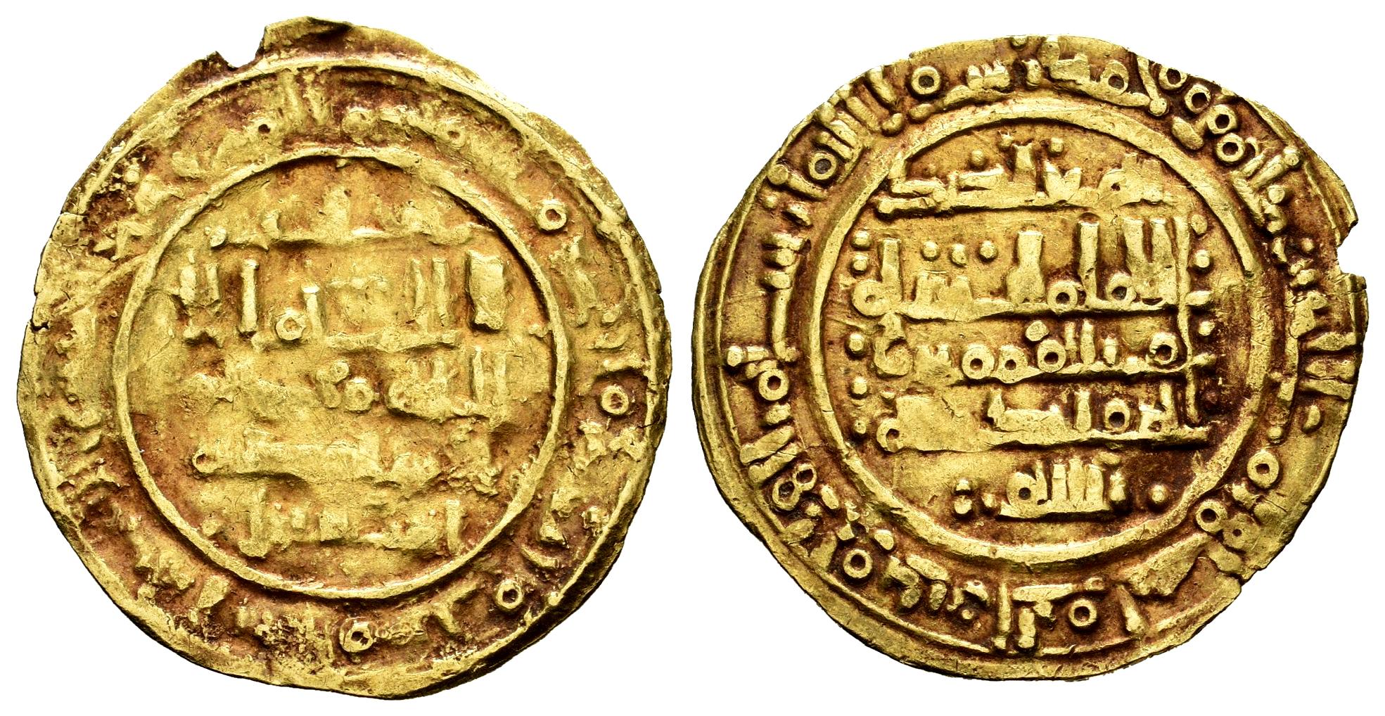 Reinos de Taifas. Abbad ibn Muhammad, Al-Mutadid (Abbadies). Dinar. 446 H. Al-Andalus. Taifa de Sevilla. (Vives-No cita). (Prieto-Suplemento 151). (Album-401). Au. 2,89 g. Cospel ligeramente faltado. Muy pocos ejemplares conocidos. Rarísima. MBC-/MBC+. Est...1200,00.