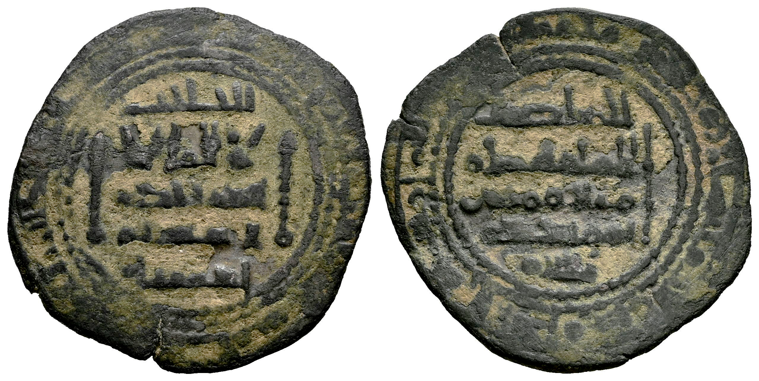 Reinos de Taifas. Abbad ibn Muhammad, Al-Mutadid (Abbadies). Dirham. 44¿9? H. Al-Andalus. Taifa de Sevilla. (Vives-No cita). (Prieto-No cita). Ve. 2,66 g. La leyenda central de la IA decorada con dos lanzas. Las obras de referencia no citan este año. Muy rara. MBC. Est...80,00.