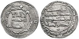 Emirato Independiente. Al-Hakam I. Dirham. 190 H. Al-Andalus. (Vives-88). (Miles-81). Ag. 2,68 g. Inusual símbolo que adorna la parte inferior de la leyenda central en el reverso. Normalmente, se presenta un pequeño "creciente"; sin embargo, en este ejemplar se puede observar una forma ligeramente cuadrada que está abierta en su parte superior, posiblemente imitando dicho creciente, con un punto en el centro. No hemos observado nada parecido en otras acuñaciones de este tipo. Rara. EBC-. Est...80,00.