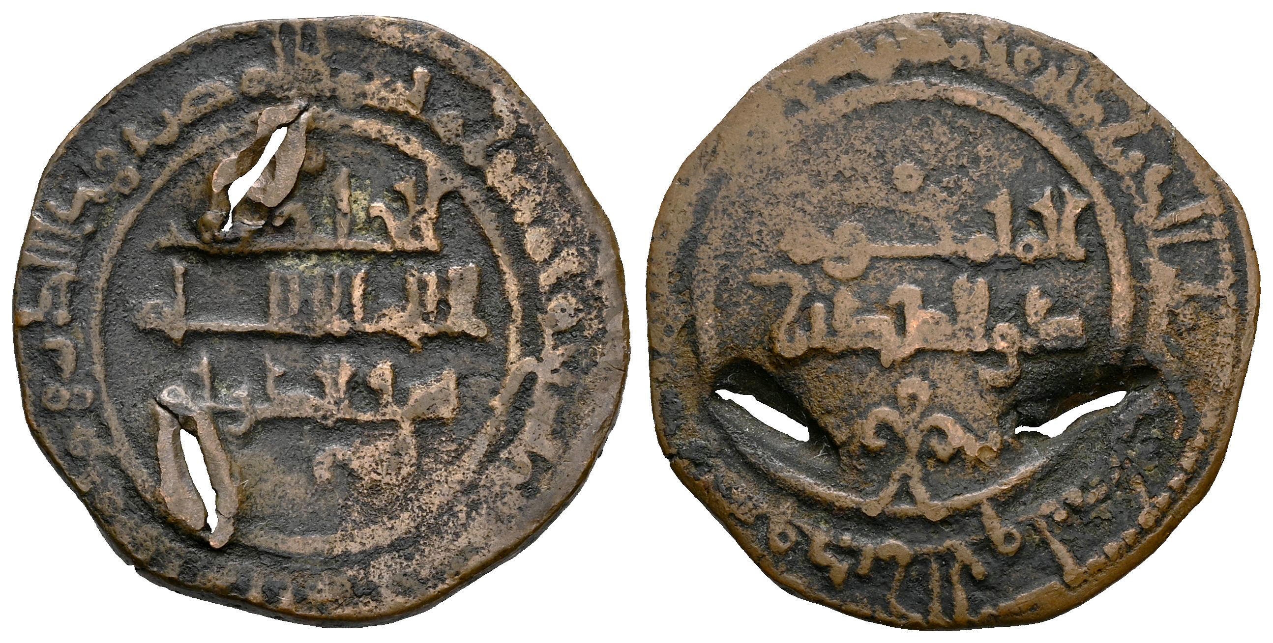 Reinos de Taifas. Yahya Al-Ma´mun (Dun-Nunids). Dirham. 459 H. Madinat Balansiya (Valencia). Taifa de Toledo. (Vives-1105). (Prieto & Vives-342a). Anv.: Citando al-Hajiv, Sharf al-Dawla. Ae. 3,52 g. Acuñada tras la Ocupación de Valencia por la Taifa de Toledo. Dos perforaciones. Muy rara. MBC-. Est...100,00.