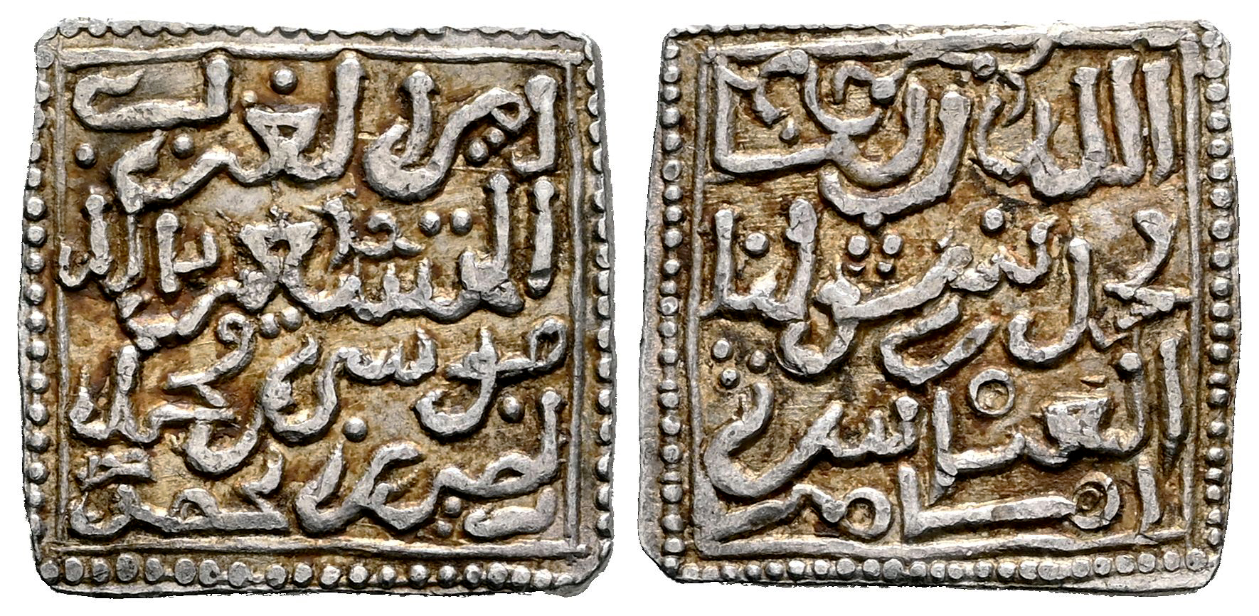 Anti-Almohades. Musa ibn Muhammad (ibn Mahfuz). Dirham. 631-660 H. Labla (Niebla). (Vives-2123 var.). (Album-4275 (ex I410)). (Lavoix-778). Ag. 1,48 g. El gobernante se titula como Amir al-gharb, "emir del oeste", es decir, del distrito portugués del Algarve. Actualmente se presume que la ceca real se ubicaba en Niebla (Labla), cerca de la ciudad de Huelva, cerca de la frontera con Portugal. Muy rara. EBC. Est...400,00.