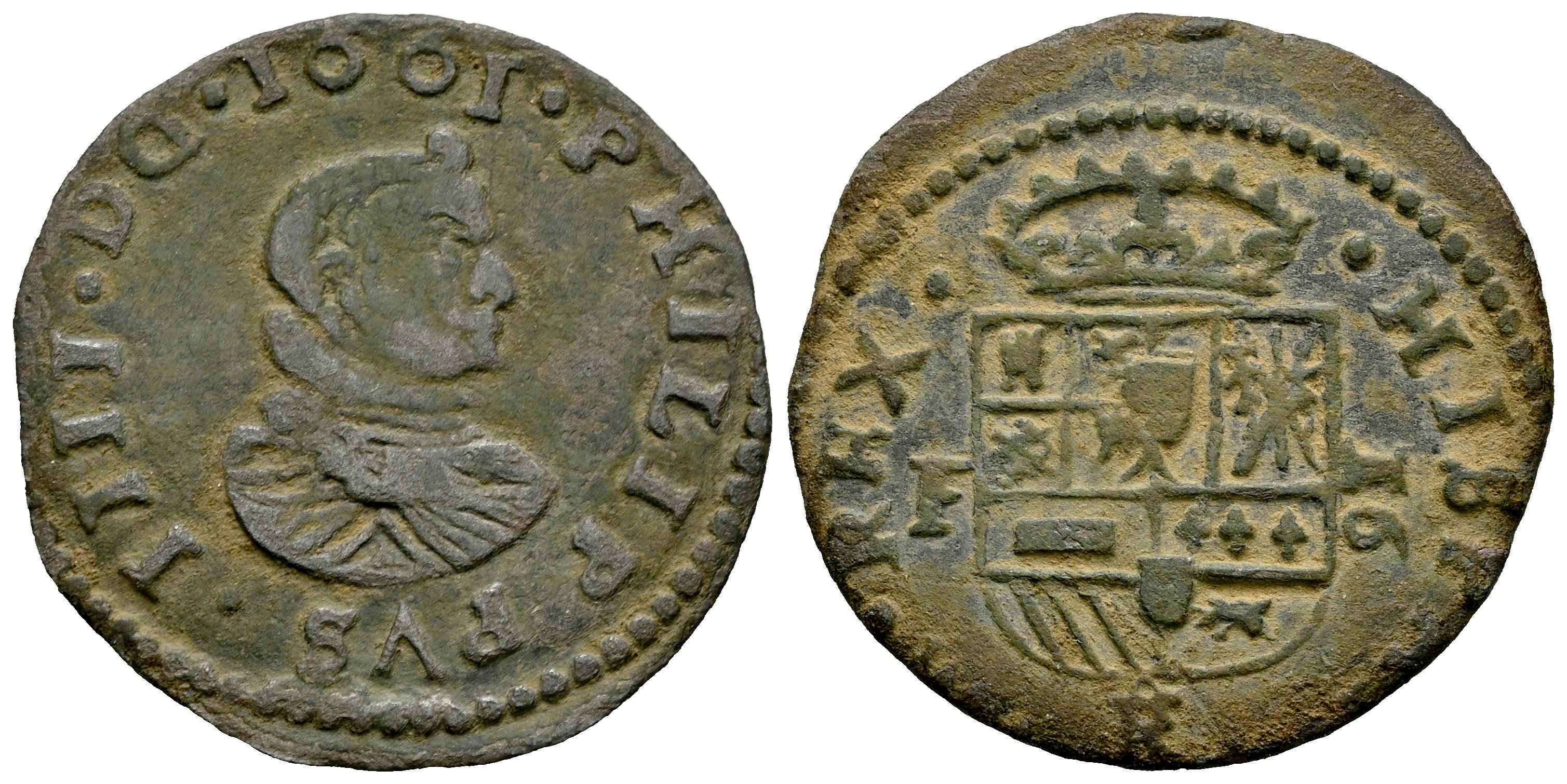 Felipe IV (1621-1665). 16 maravedís. 1661. Trujillo. F. (Cal-501). (Jarabo-Sanahuja-M680). Ve. 3,29 g. Sin gráfilas interiores. Muy rara. MBC-. Est...200,00.