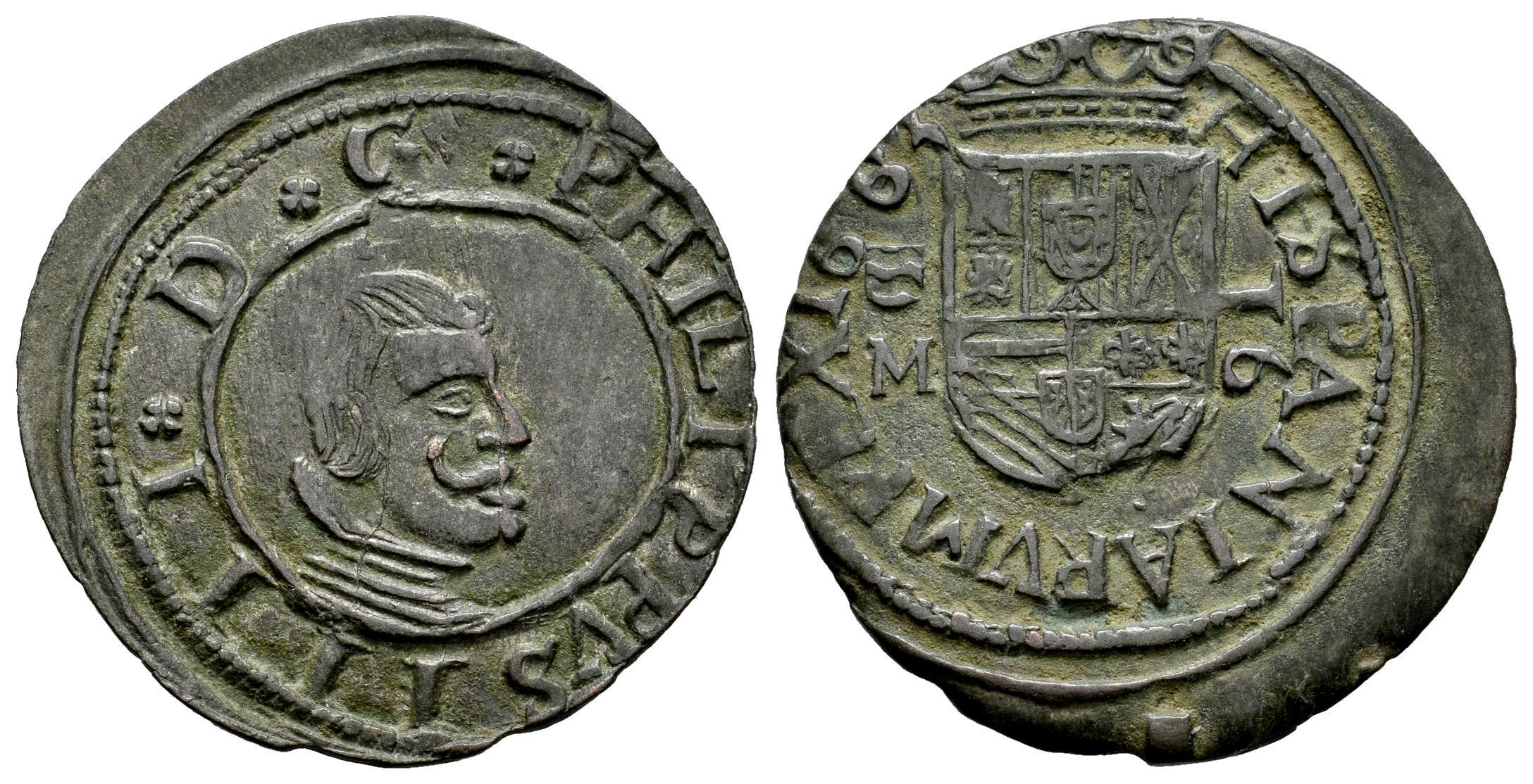 Felipe IV (1621-1665). 16 maravedís. 1663. Valladolid. M. (Cal-510 var.). (Jarabo-Sanahuja-No cita). Anv.: PHILIPPVS IIII · D · G ·. Ae. 3,49 g. El segundo 6 de la fecha 1663, está rectificado sobre un 3. Muy raro. EBC-/MBC+. Est...80,00.
