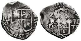 Felipe IV (1621-1665). 1 real. 1752. Potosí. E. (Cal-748). Ag. 2,50 g. Tipo transicional. Escudo completo con (I-A)-P-5 a la izquierda y (I-O-E)-2 a la derecha, pilares con F-I-IIII en la parte superior y E-I-(E) en la parte inferior. Rara. MBC-/MBC. Est...180,00.