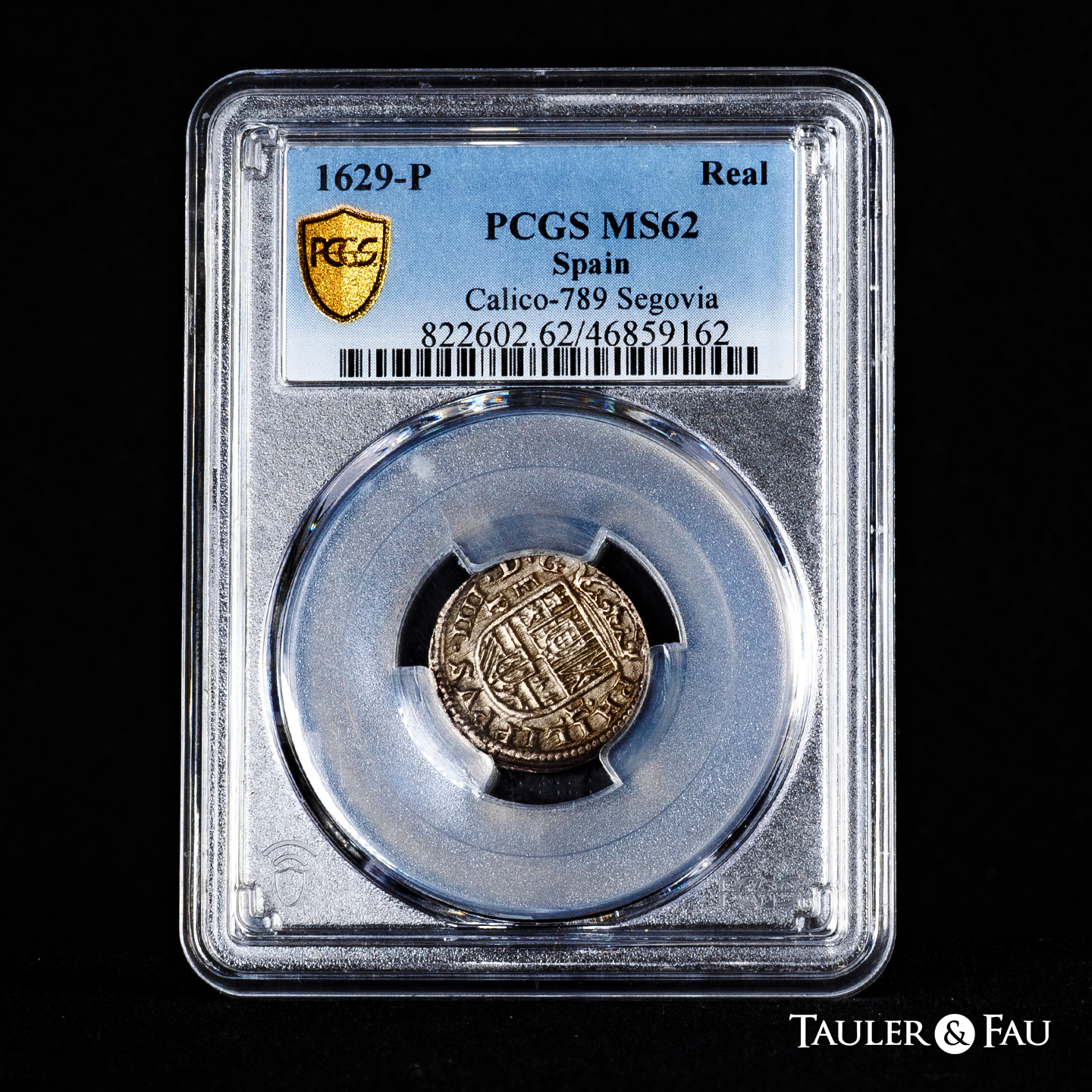Felipe IV (1621-1665). 1 real. 1628. Segovia. P. (Cal-788). Au. Encapsulada por PCGS como MS 62. Error en la fecha de la etiqueta de la cápsula. Est...350,00.