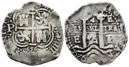 Felipe IV (1621-1665). 4 reales. 1656. Potosí. E. (Cal-1119). Ag. 12,55 g. PH bajo la corona del reverso. Ordinal del rey visible. Triple fecha, triple ceca y triple ensayador. Escasa así. MBC. Est...600,00.