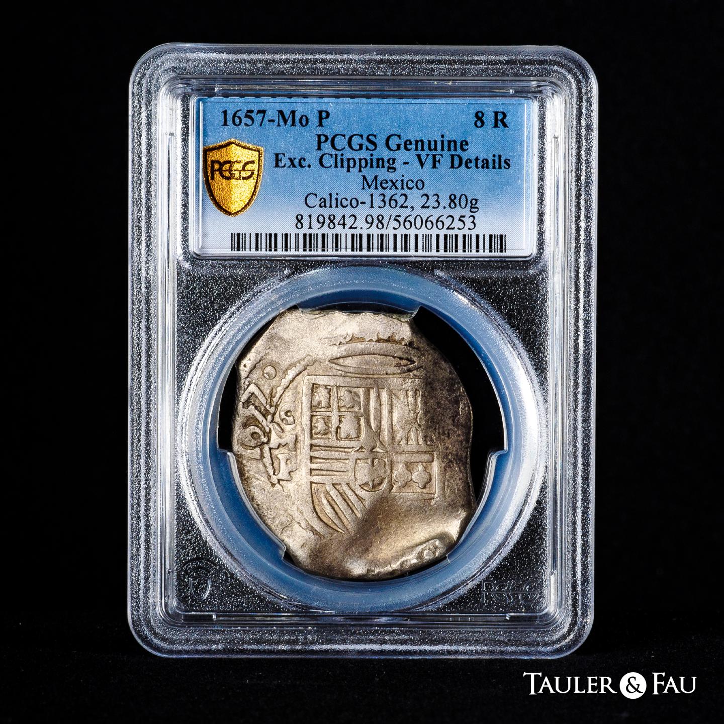 Felipe IV (1621-1665). 8 reales. 1657. México. P. (Cal-1362). Ag. 23,80 g. Fecha completa. Peso bajo, recortada. Rara. Encapsulada por PCGS como Genuine VF Details, Exc. Clipping. NGC-G. Est...900,00.