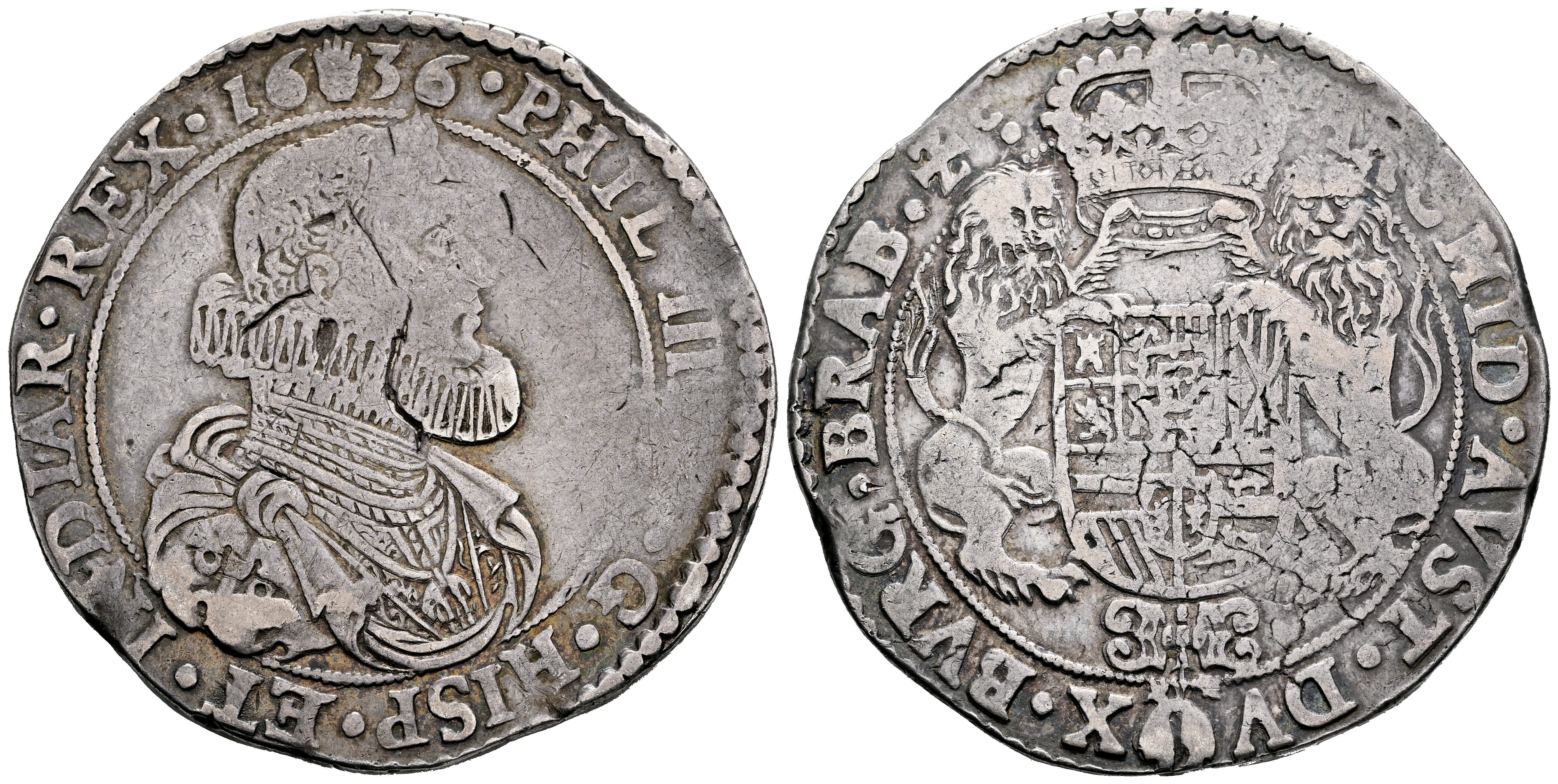 Felipe IV (1621-1665). 1 ducatón. 1636. Amberes. (Tauler-2871). (Vti-1161). (Vanhoudt-640.AN). Ag. 32,31 g. Plata agria. Pátina. MBC-/MBC. Est...200,00.