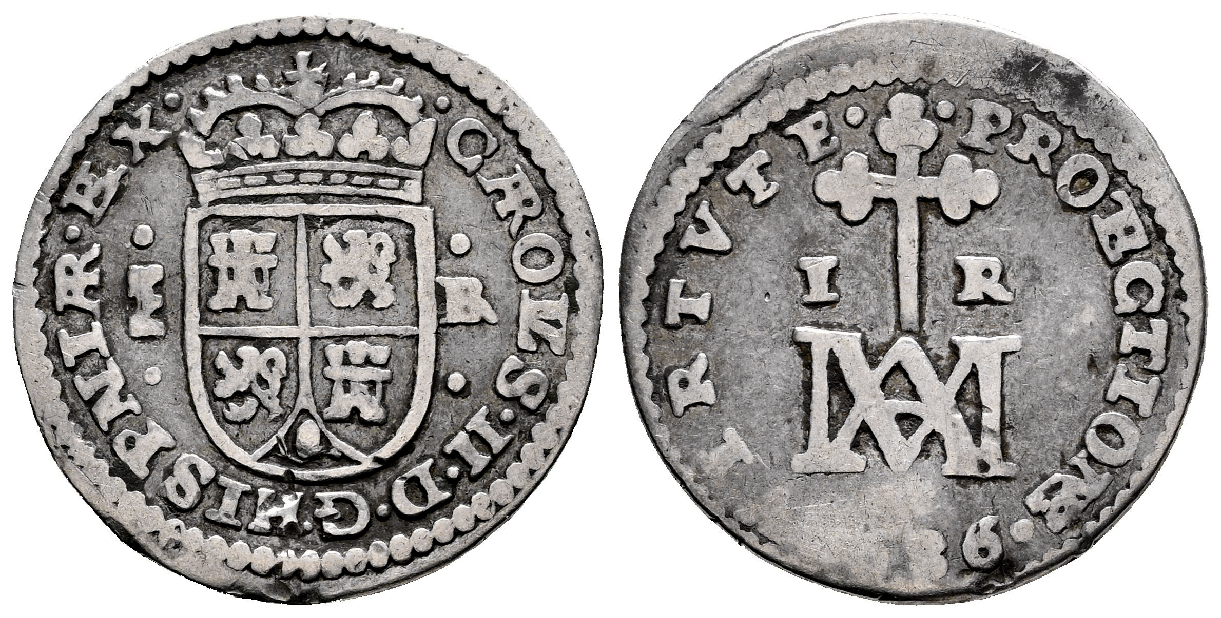 Carlos II (1665-1700). 1 real. 1686. Segovia. BR. (Cal-310). Ag. 2,53 g. Tipo "María". Golpes. Rara. MBC-. Est...150,00.