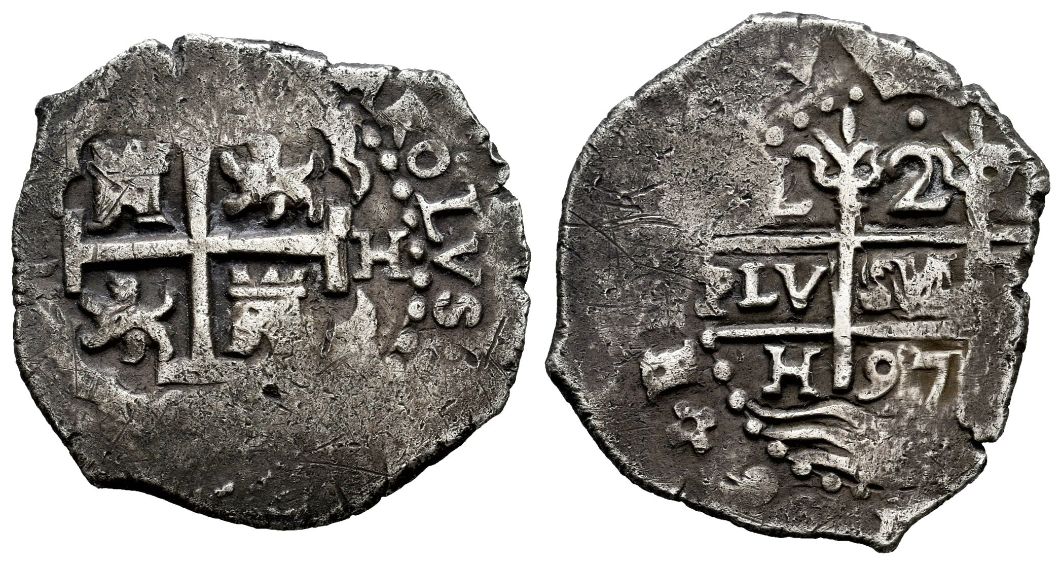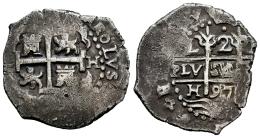 Carlos II (1665-1700). 2 reales. 1697. Lima. H. (Cal-355). Ag. 6,39 g. Doble ensayador. Visible parte del nombre del rey. Bonita pátina. Rara. MBC+. Est...350,00.