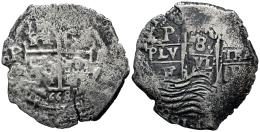 Carlos II (1665-1700). 8 reales. 1668. Potosí. E. (Cal-699). Ag. 21,48 g. Triple fecha, dos de ellas parciales. Oxidaciones marinas. MBC-. Est...250,00.