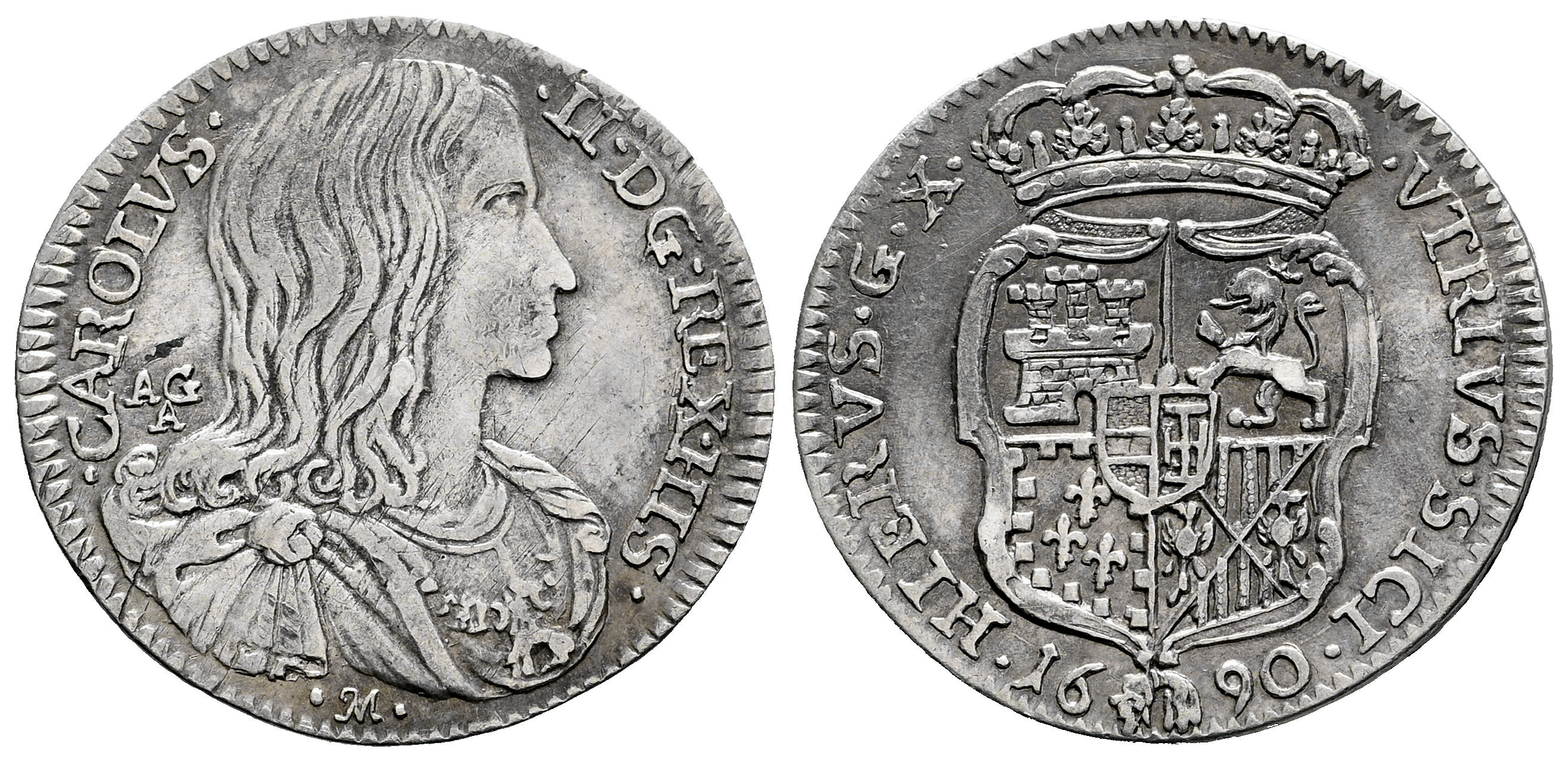 Carlos II (1665-1700). 1 carlino. 1690. Nápoles. AG/A. (Tauler-3161). (Vti-156). (Mir-302/6). Ag. 2,51 g. Ligero tono. MBC+. Est...120,00.