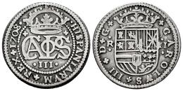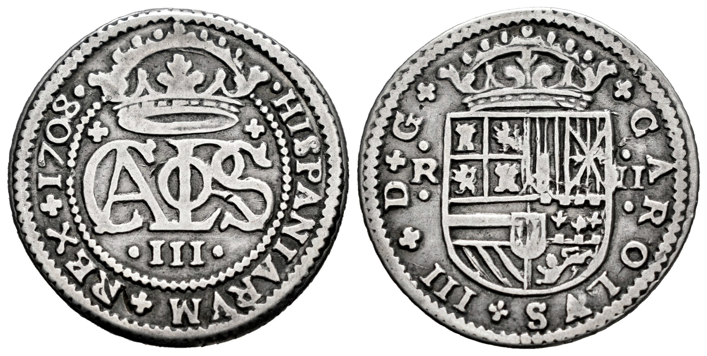 Carlos III, Pretendiente (1701-1714). 2 reales. 1708. Barcelona. (Cal-29). Ag. 4,54 g. MBC. Est...60,00.