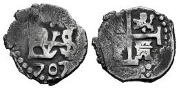 Felipe V (1700-1746). 1/2 real. 1707. Lima. (Cal-136). Ag. 1,52 g. No figuraba en la colección Sellschopp. Muy rara. MBC/MBC-. Est...110,00.