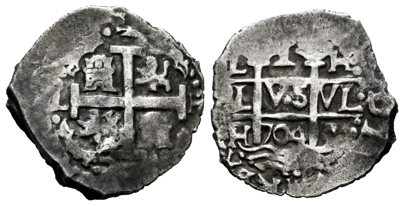 Felipe V (1700-1746). 1 real. 1704. Lima. H. (Cal-381). Ag. 2,88 g. Triple ensayador. Escasa. MBC+/MBC. Est...150,00.
