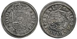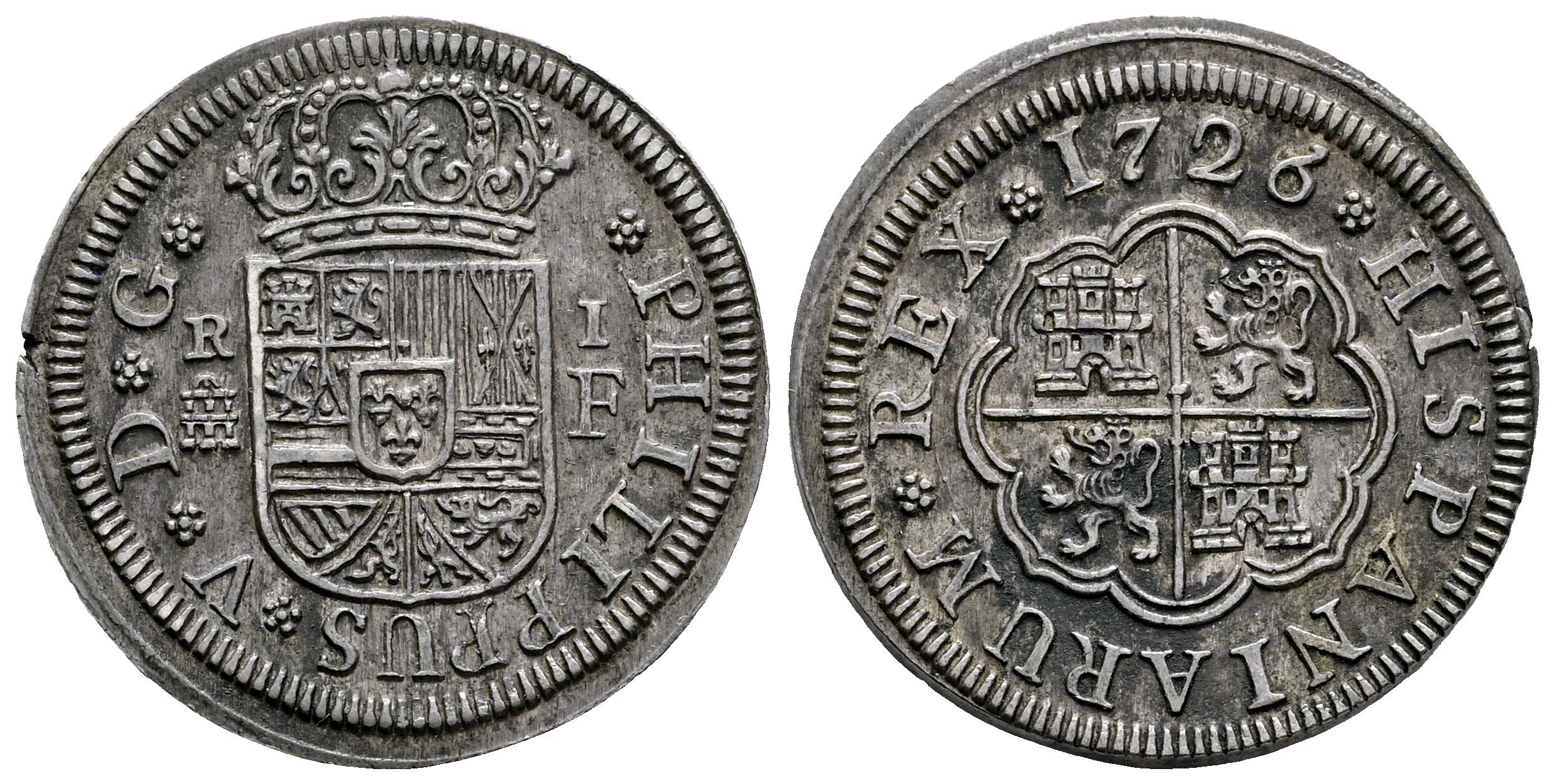 Felipe V (1700-1746). 1 real. 1726. Segovia. F. (Cal-624). Ag. 2,47 g. Pátina. Leve defecto en el canto. EBC. Est...100,00.
