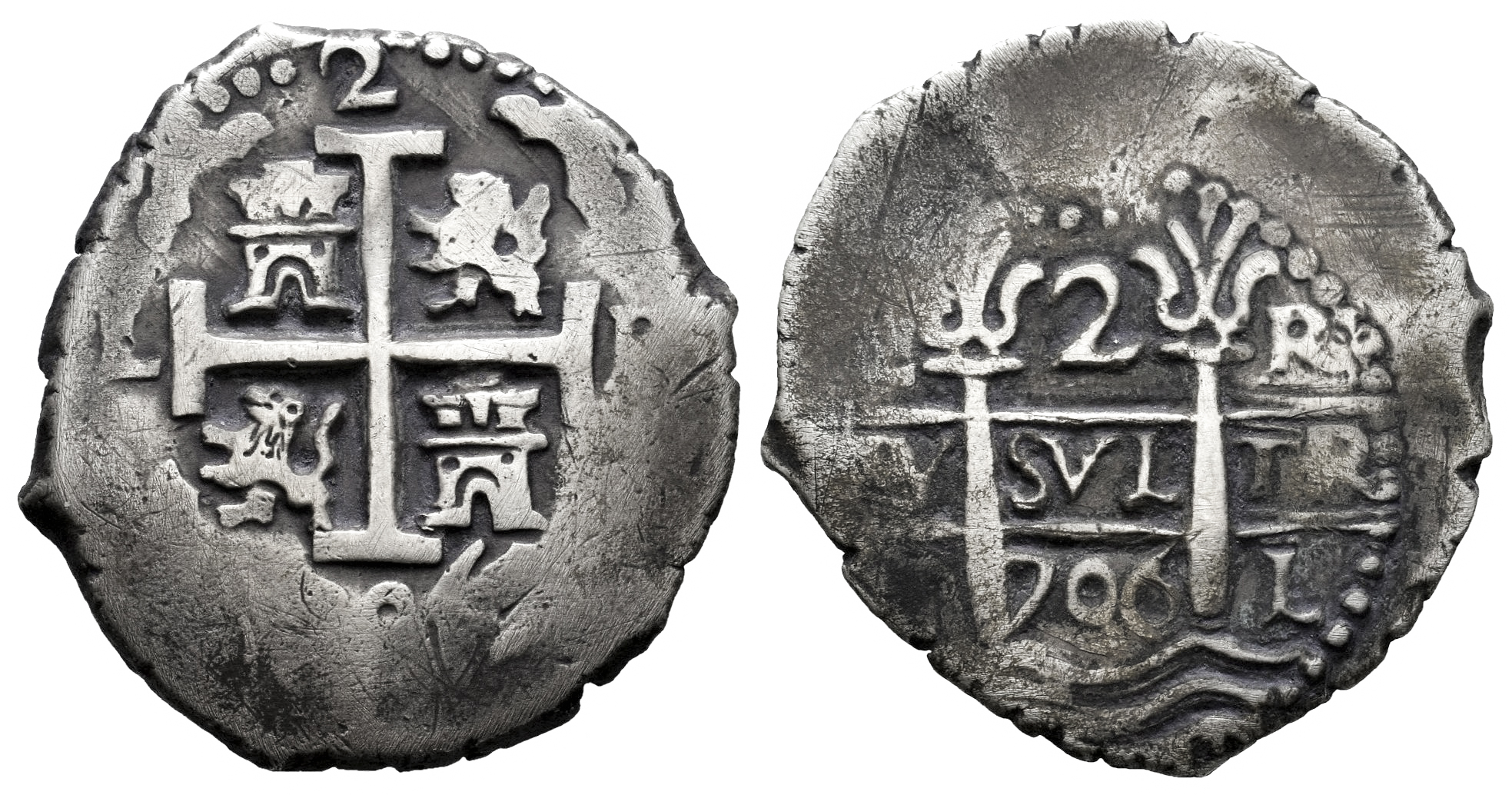 Felipe V (1700-1746). 2 reales. 1706. Lima. R. (Cal-717). Ag. 6,47 g. Doble fecha, una de ellas parcial y doble ensayador, uno de ellos parcial. Rara. MBC/MBC+. Est...250,00.