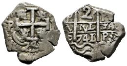 Felipe V (1700-1746). 2 reales. 1741/0 - 1741. Potosí. P. (Cal-924). Ag. 6,10 g. Clara sobrefecha solo en anverso 1/0. Doble fecha y doble ensayador. Ligera pátina. Rara. MBC/MBC+. Est...250,00.