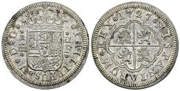Felipe V (1700-1746). 2 reales. 1727. Segovia. F. (Cal-961). Ag. 6,87 g. Ligero tono. Restos de brillo original. EBC+. Est...200,00.