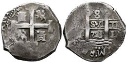 Felipe V (1700-1746). 8 reales. 1723. Lima. M. (Cal-1297). Ag. 26,46 g. Doble ensayador. Flan ancho con periferias planas pero con fecha clara entre pilares casi completos, la cruz entera. Bonita pátina de monetario. Rara. MBC+. Est...600,00.