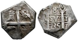 Felipe V (1700-1746). 8 reales. 1735/4. Lima. N. (Cal-1309, no cita esta sobrefecha). Ag. 16,65 g. Rara sobrefecha. Recortada a finales del siglo XVIII en el norte de África, la moneda de 8 reales circulaba ampliamente por rutas comerciales internacionales. Aunque no existe documentación oficial que lo confirme, se cree que estas monedas eran recortadas para extraer plata, pero seguían siendo aceptadas internacionalmente por su pureza y prestigio. Las monedas recortadas de 8 reales representan un enigma numismático, posiblemente ligado a normas monetarias locales en el norte de África. El análisis de ejemplares procedentes de lugares como Orán y Argelia sugiere que su peso fue reducido de forma estructurada y el patrón indica que el peso se redujo en un 55-62% de su peso original: los 8 reales a 15-17 gramos de su peso original de 27,1 gramos y los 4 reales a 7-8 gramos de los 13,55 gramos originales, lo que apunta a una posible regulación improvisada. Algunas teorías las relacionan con las emisiones de Trípoli de 1773. Este misterio sigue sin resolverse por completo. MBC. Est...300,00.