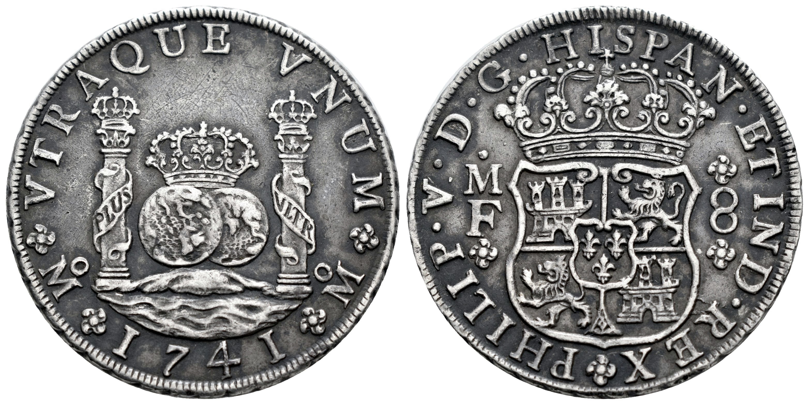 Felipe V (1700-1746). 8 reales. 1741. México. MF. (Cal-1458). Ag. 26,68 g. Pátina. Atractiva. Ex Noonans (20/06/2024), lote 510. MBC+. Est...600,00.