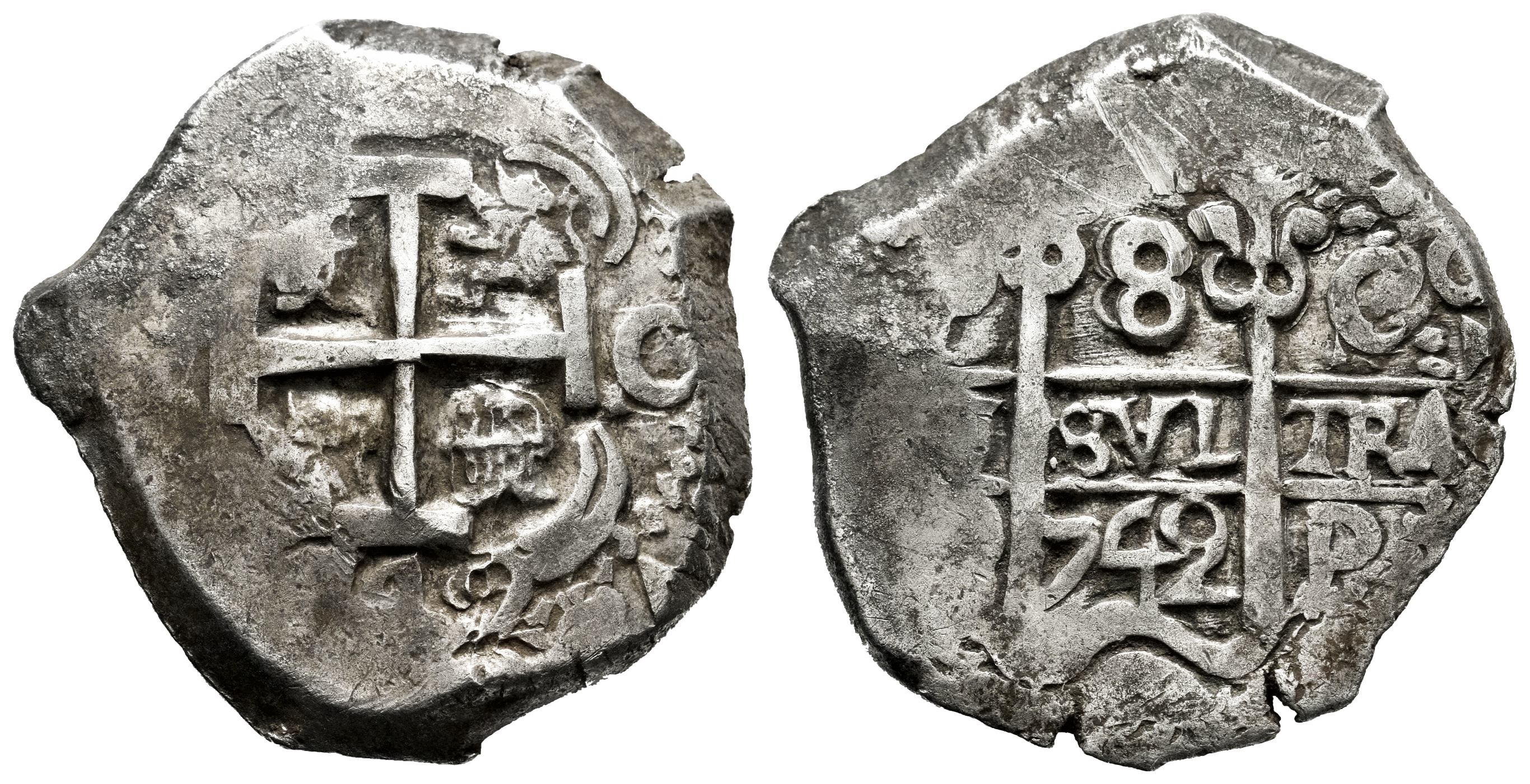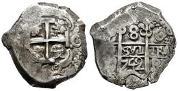 Felipe V (1700-1746). 8 reales. 1742. Potosí. C/P. (Cal-1582). Ag. 27,20 g. Doble fecha y doble ensayador rectificado. Ligero tono. MBC+. Est...450,00.
