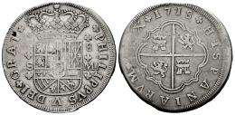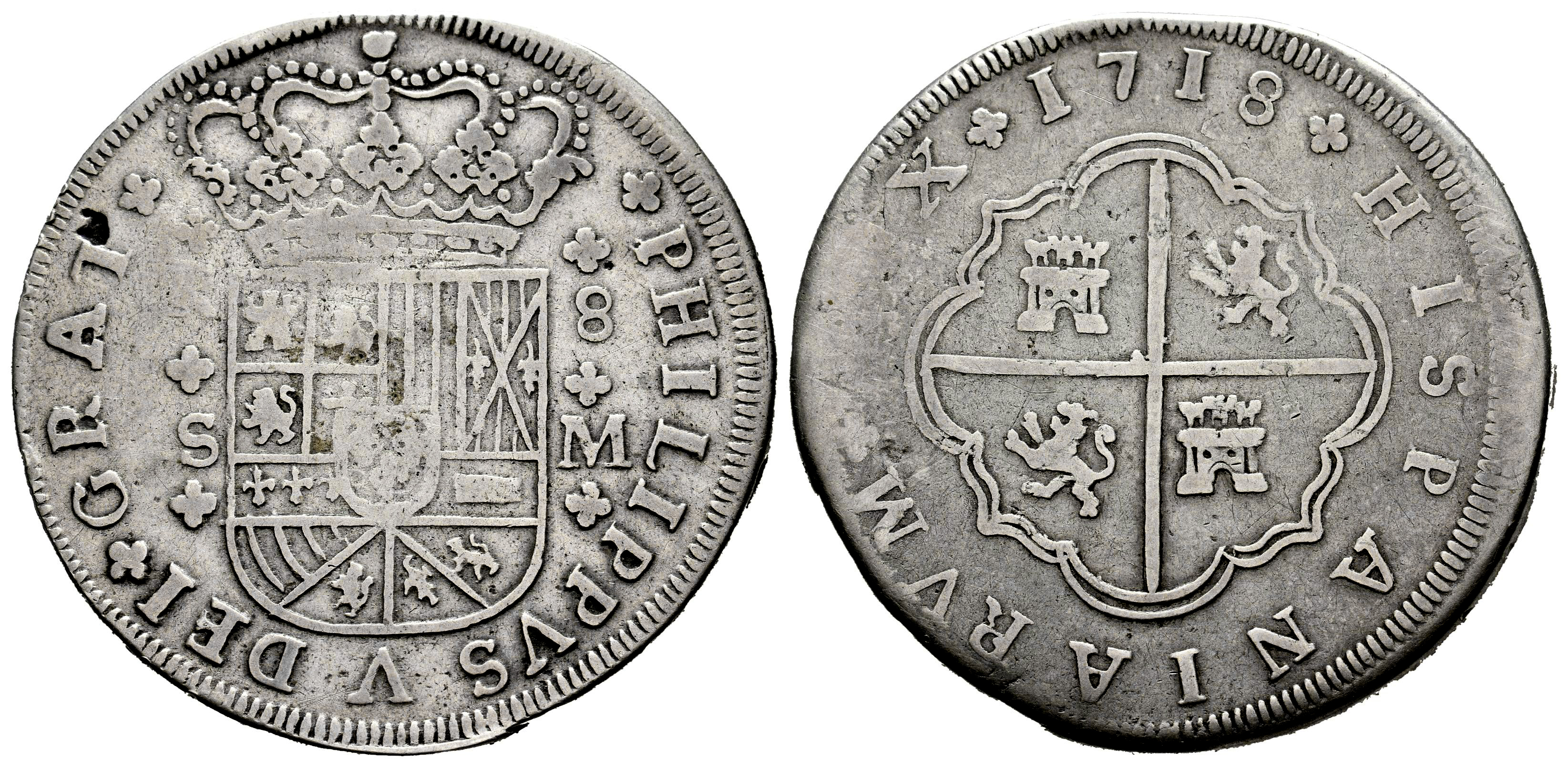Felipe V (1700-1746). 8 reales. 1718. Sevilla. M. (Cal-1617). Ag. 21,31 g. Armas de Borgoña y la de Austria intercambiadas. Armas de Borgoña con 3 flores de lis. Escasa. MBC-/BC+. Est...250,00.